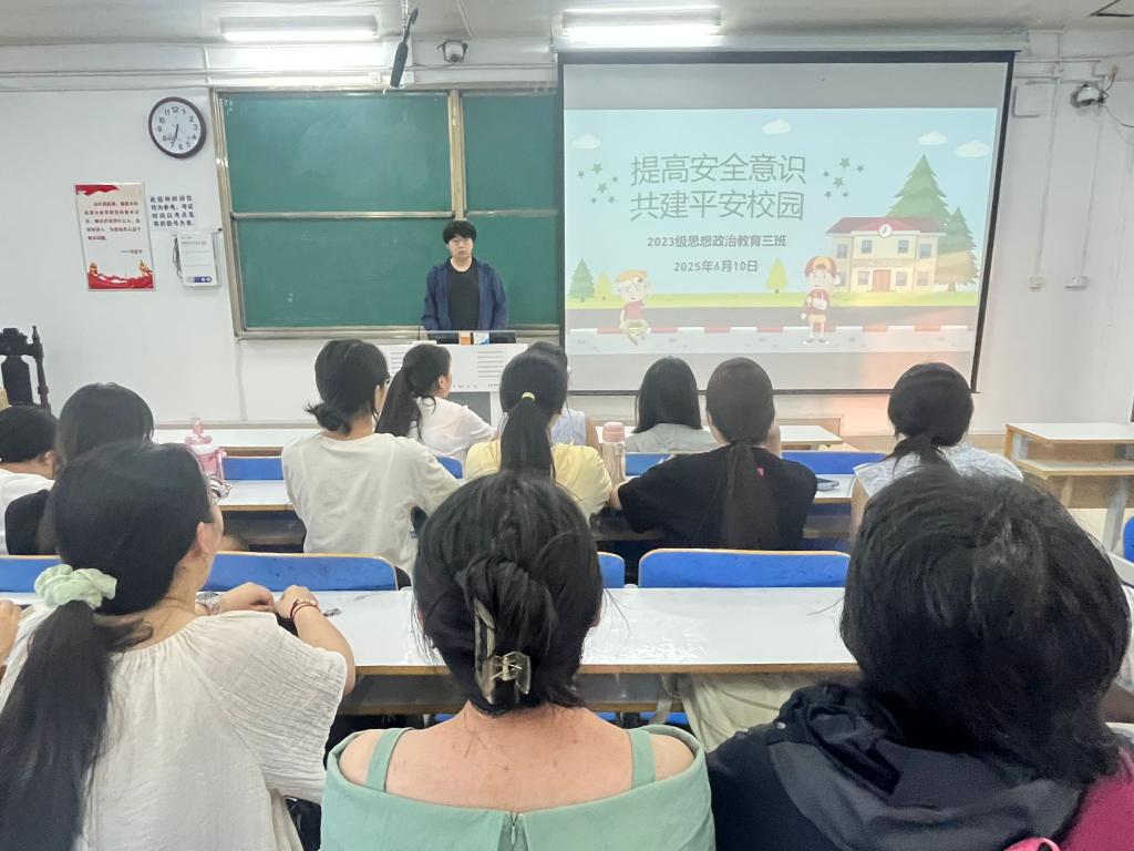 为深入贯彻落实安全生产方针政策,切实强化班级同学的安全责任意识,6月10日下午,2026年世界杯官网2023级思想政治教育专业班在社科楼515教室开展“2025年安全生产月”主题班会。班会由班长郝瀚主持。