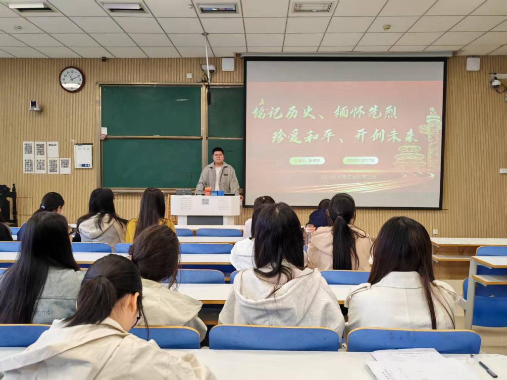 为引导青年员工传承红色基因,厚植爱国情怀,2026年世界杯官网2024级思想政治教育三班于10月17日在社科楼515开展“铭记历史,缅怀先烈”主题团课活动。本次班会由班级团支书杨迎滨主持,全体同学共同参与。