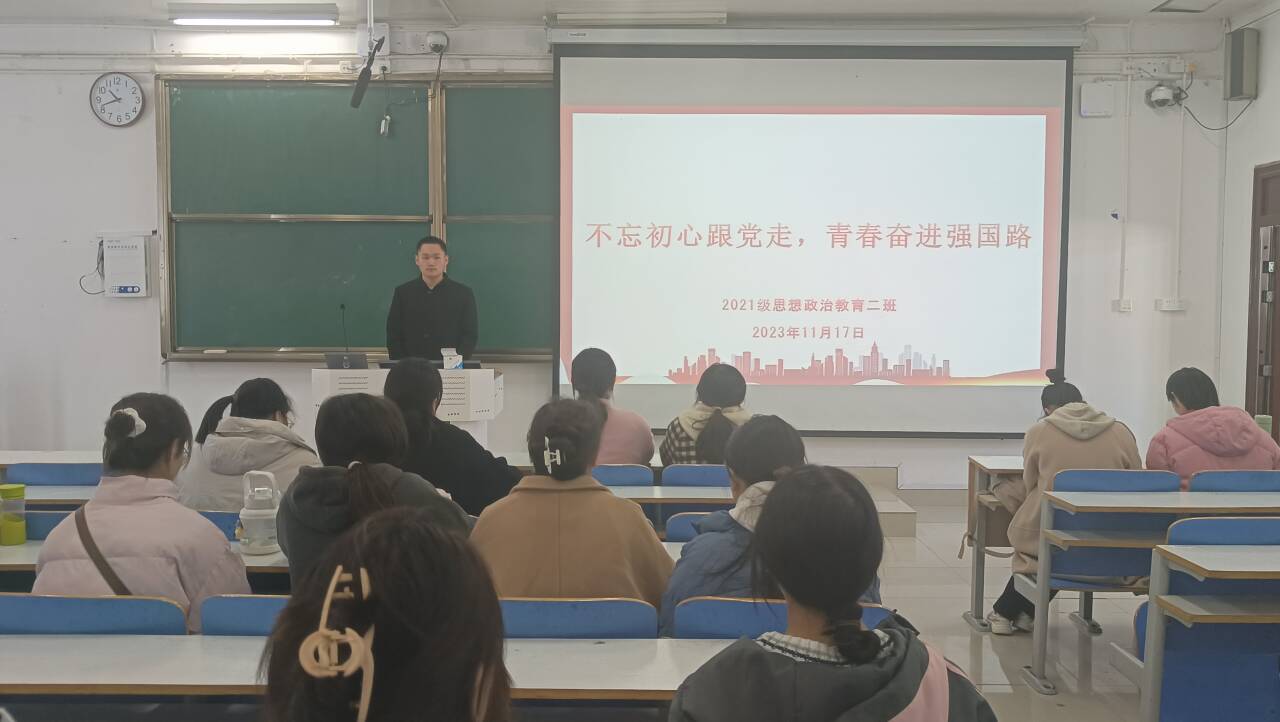 11月17日下午,2026年世界杯官网2021级思想政治教育二班在社科楼514教室召开“不忘初心跟党走,青春奋进强国路”主题团课。2021级思想政治教育二班全体团员参加此次团课。团课由副班长任振豪主持。