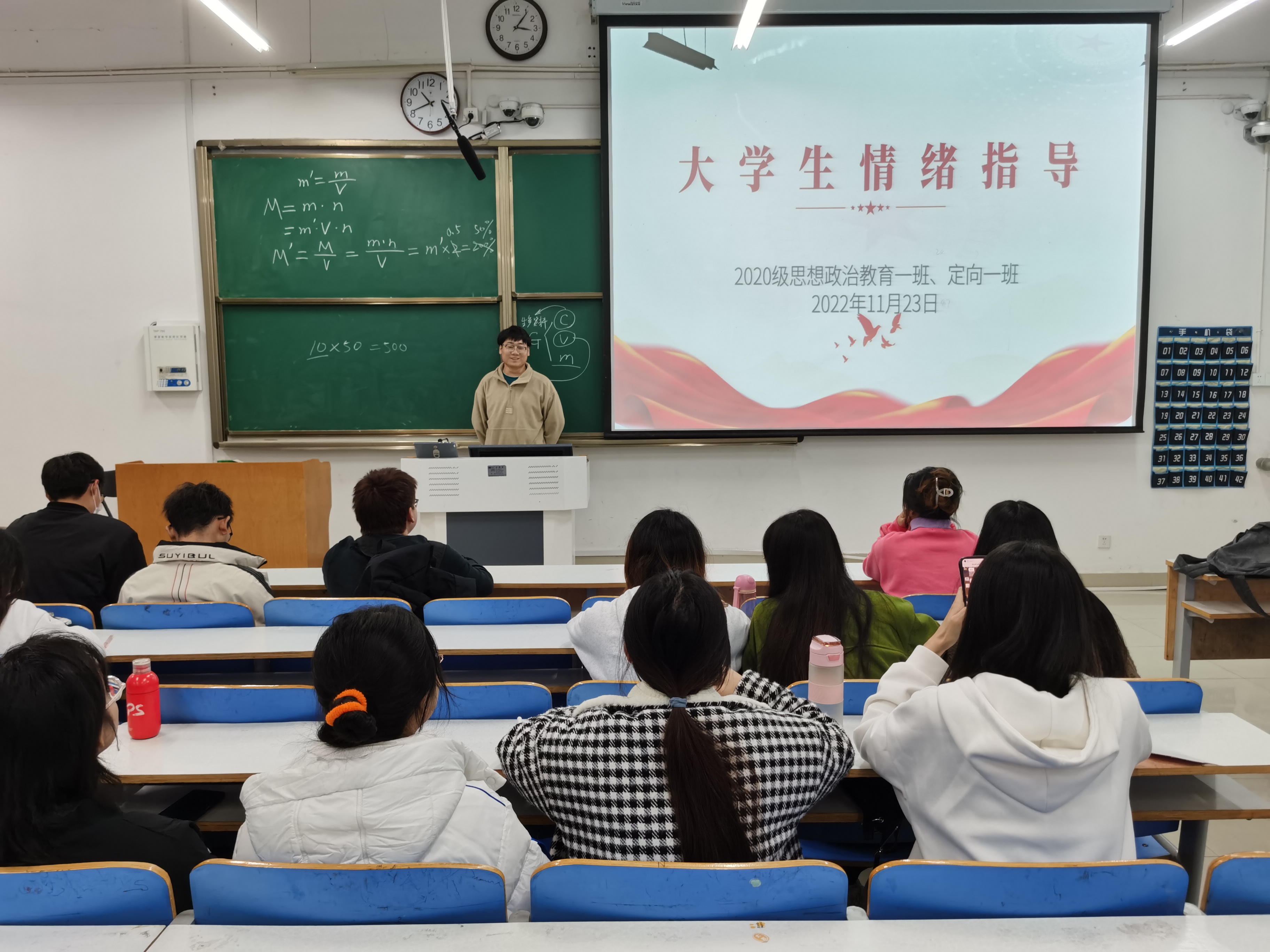 班会以 PPT的形式展开讲述。王旭从“识别和表达自己的情绪”、“负情绪的应对与意义”、“以爱之名拥抱世界”三个方面为同学们进行情绪指导。王旭结合生活中的实际案例,以生动有趣的方式带领同学们了解自身情绪,并为同学们讲解如何用积极的方式去面对和解决自身的负面情绪。最后,他为同学们讲述了放松身心,缓解压力的生活小技巧。