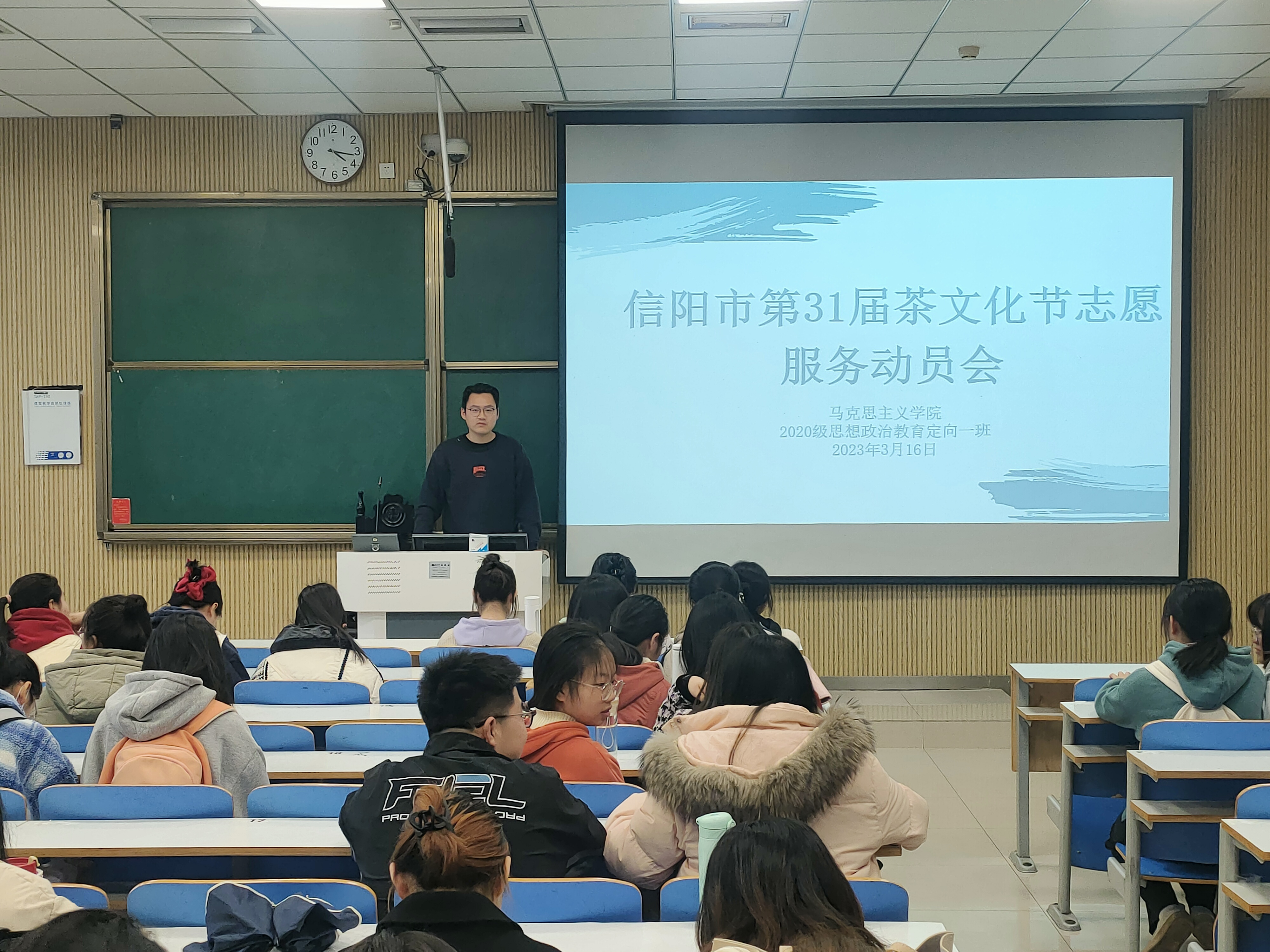 3月16日上午,2026年世界杯官网2020级思想政治教育定向一班在社科楼515教室顺利举行了信阳市第31届茶文化节志愿服务动员会。此次班会由团支书朱紫峰主持。