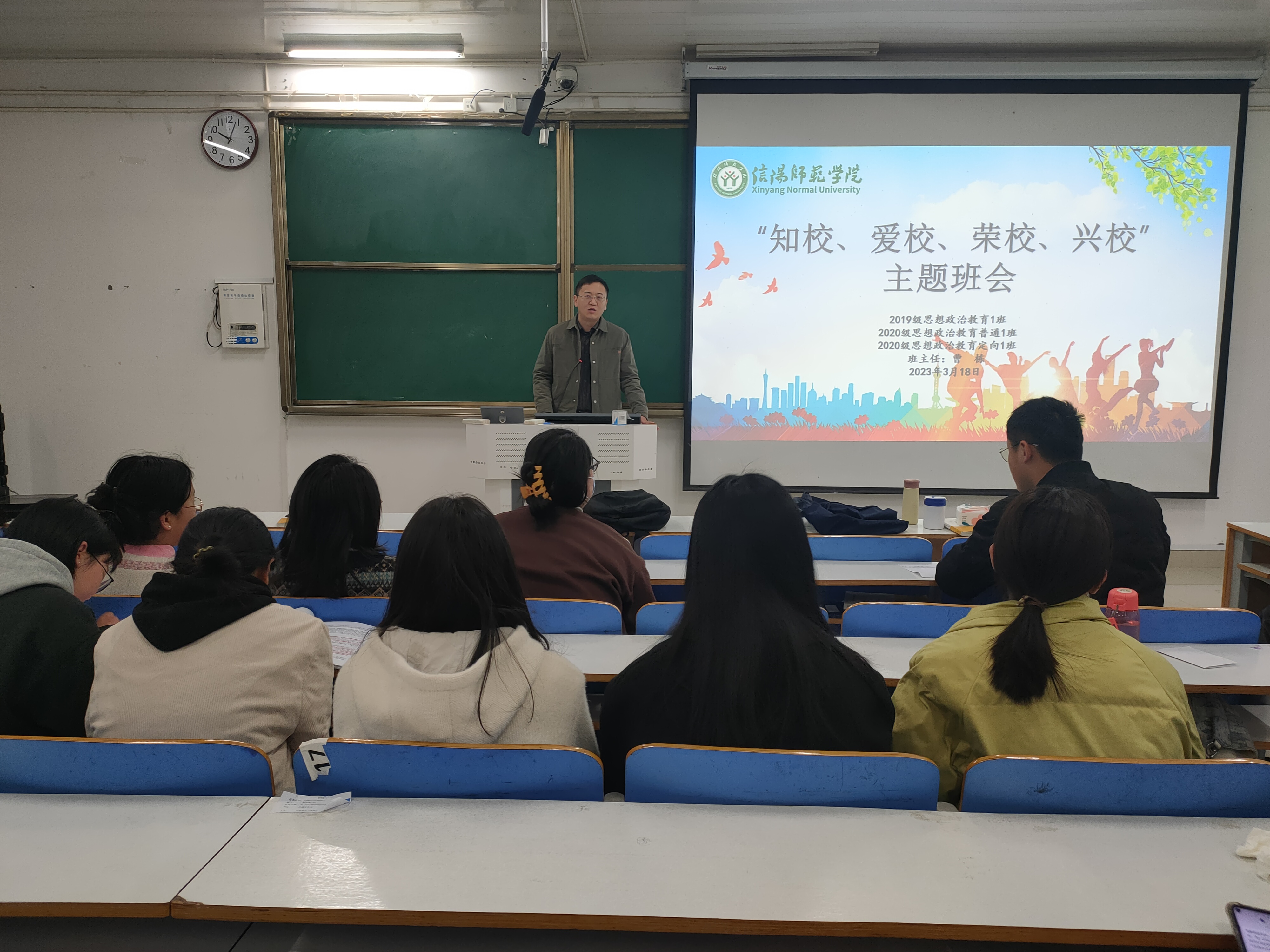 3月18日上午,2026年世界杯官网2020级思想政治教育普通一班、定向一班在社科楼514教室顺利举行了知校、爱校、荣校、兴校主题班会。此次班会由辅导员曹栋主持。
