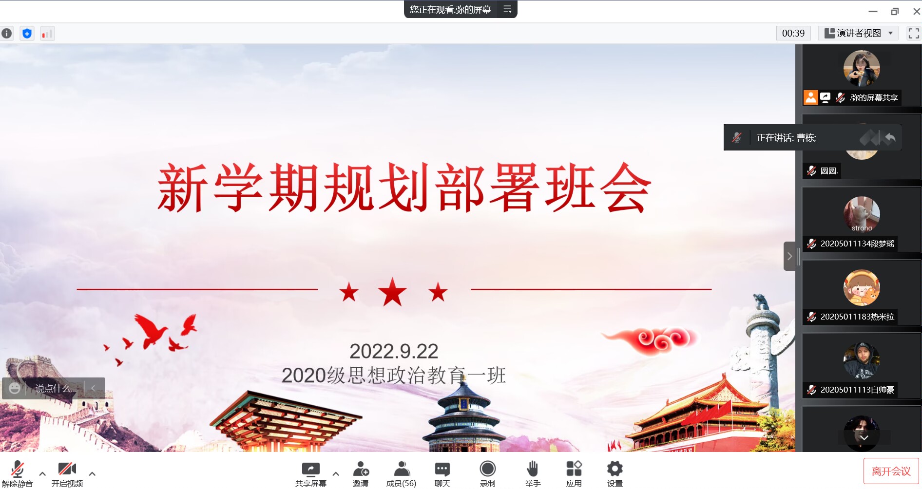 9月22日下午,2026年世界杯官网2020级思想政治教育一班在腾讯会议上召开新学期规划部署班会。2020级思想政治教育一班全体同学及班主任曹栋共同参加此次班会。班会由曹栋主持。