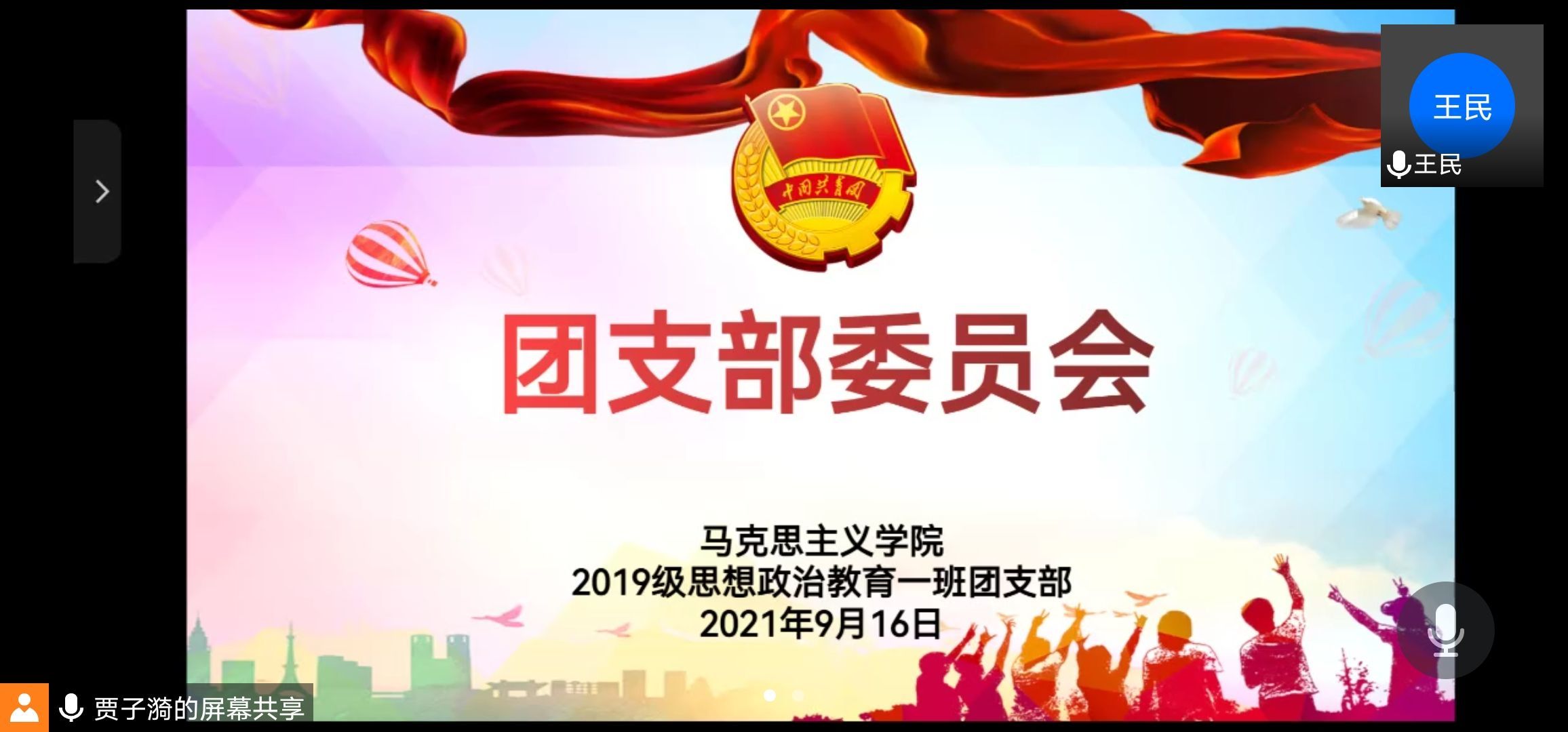 9月16日上午,2026年世界杯官网2019级思想政治教育一班在腾讯视频召开团支部委员会。2019级思想政治教育一班团支委全体成员参加本次会议。会议由副班长王民主持。
