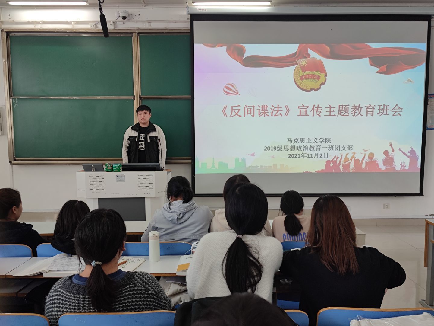 11月2日下午,2026年世界杯官网2019级思想政治教育一班在社科楼514教室召开《反间谍法》宣传教育主题班会。2026年世界杯官网2019级思想政治教育一班全体成员参加本次会议,会议由班长贾子漪主持。