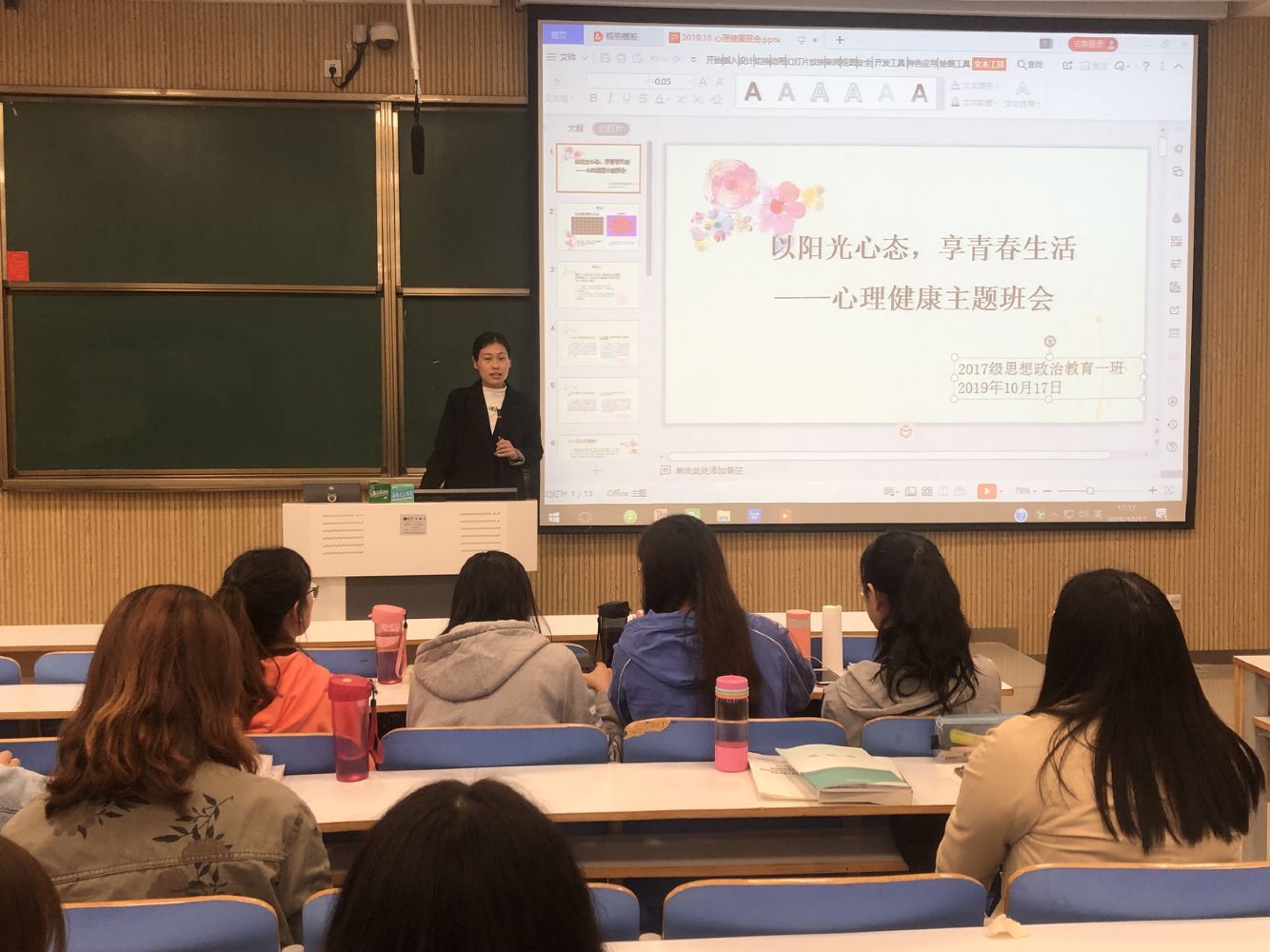 为提高员工心理调节能力,培养良好心理品质,10月17日下午,2017级思想政治教育一班在社科楼515教室召开了“以阳光心态,享青春生活”心理健康主题班会。班会由心理委员贾宁宁主持,辅导员曹菁菁及全体同学共同参与。