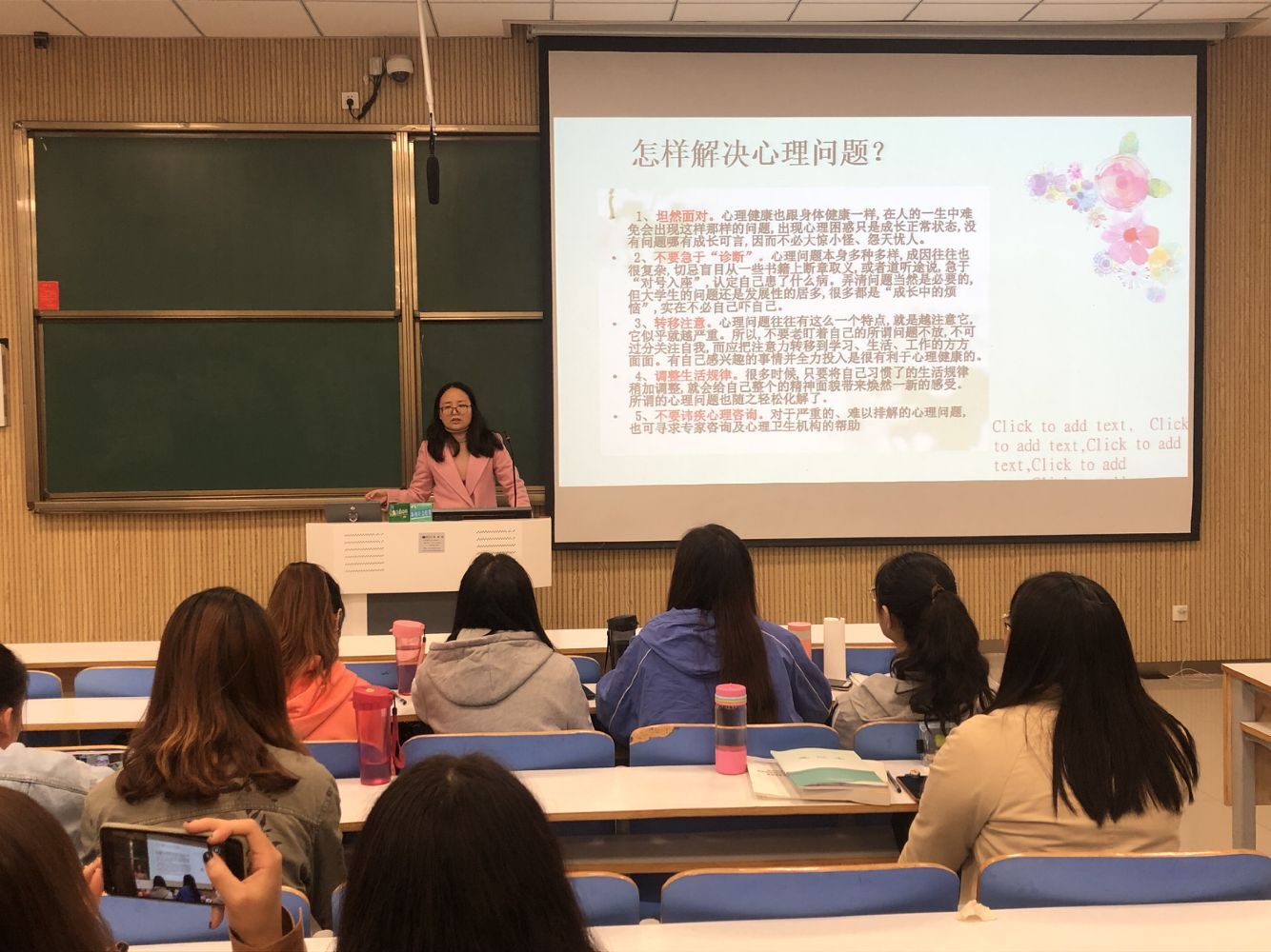 班会通过PPT解说、播放视频、员工代表发言等形式展开,内容主要从学习问题、人际交往问题、性格与情绪问题、神经质问题四方面出发,员工代表耿海利为大家介绍了学习小妙招,缓解大家复习压力。贾宁宁为大家整理了多个解决心理压力的方法,她指出要正确处理心理问题,养成良好生活习惯,自觉调整生活规律,转移注意力。辅导员曹菁菁总结发言,她表示同学们要形成正确的学习习惯,不要施加太多心理压力,在学习之余要注重身体健康,多锻炼,形成良好体魄。