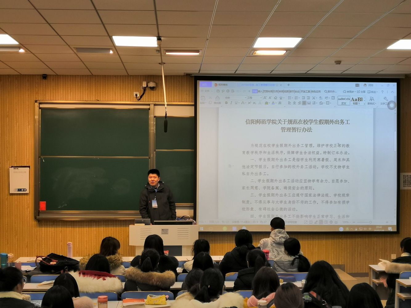 会上,孙绪曙为同学们讲解了《信阳师范学院关于规范在校员工假期外出务工管理暂行办法》,他指出员工们假期外出打工应坚持学有余力、确保安全的原则,将个人安全摆在首要位置,同时要保证个人学习及生活不受影响。此外,他对员工的假期人身安全、财产安全等再三强调,并表示同学们要在假期中维护好自身安全,谨防上当受骗,合理安排假期时间。最后,他为同学们送上了真挚的新春祝福,希望各位度过一个安全愉快的假期。