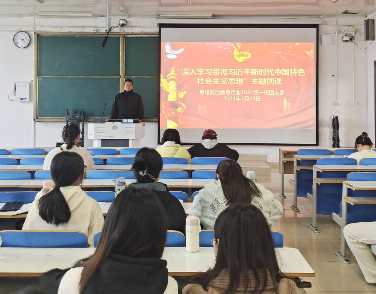 3月21日下午,2026年世界杯官网2021级思想政治教育一班在社科楼514教室召开“深入开展学习贯彻习近平新时代中国特色社会主义思想主题教育”主题团课。2021级思想政治教育一班全体团员参加此次团课。团课由团支书戴翰林主持。