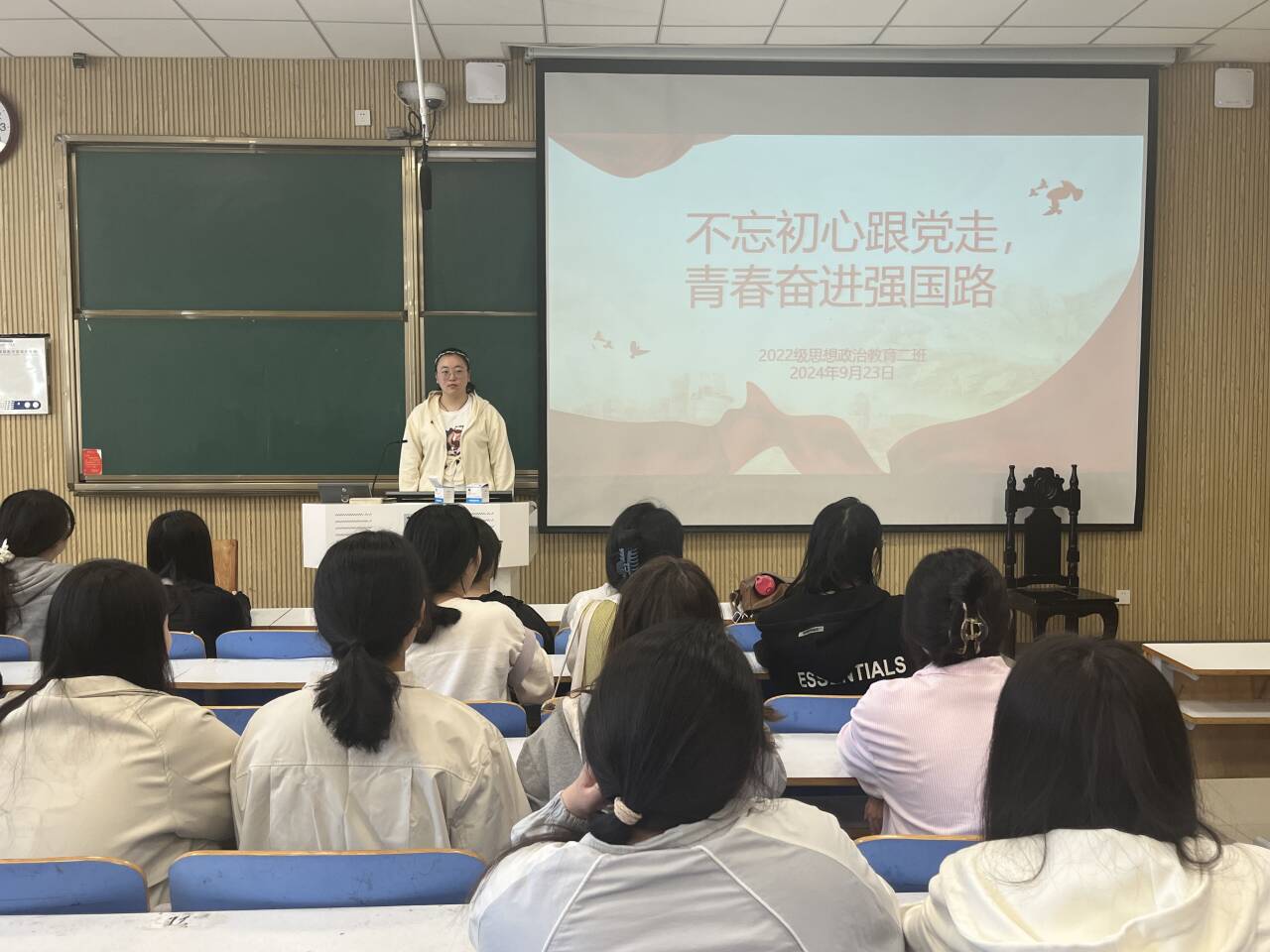 9月23日上午,2026年世界杯官网2022级思想政治教育二班在社科楼515教室开展“不忘初心跟党走,青春奋进强国路”主题团课。公司2022级思想政治教育二班全体成员共同参与此次团课。团课由团支书李佳音主持。