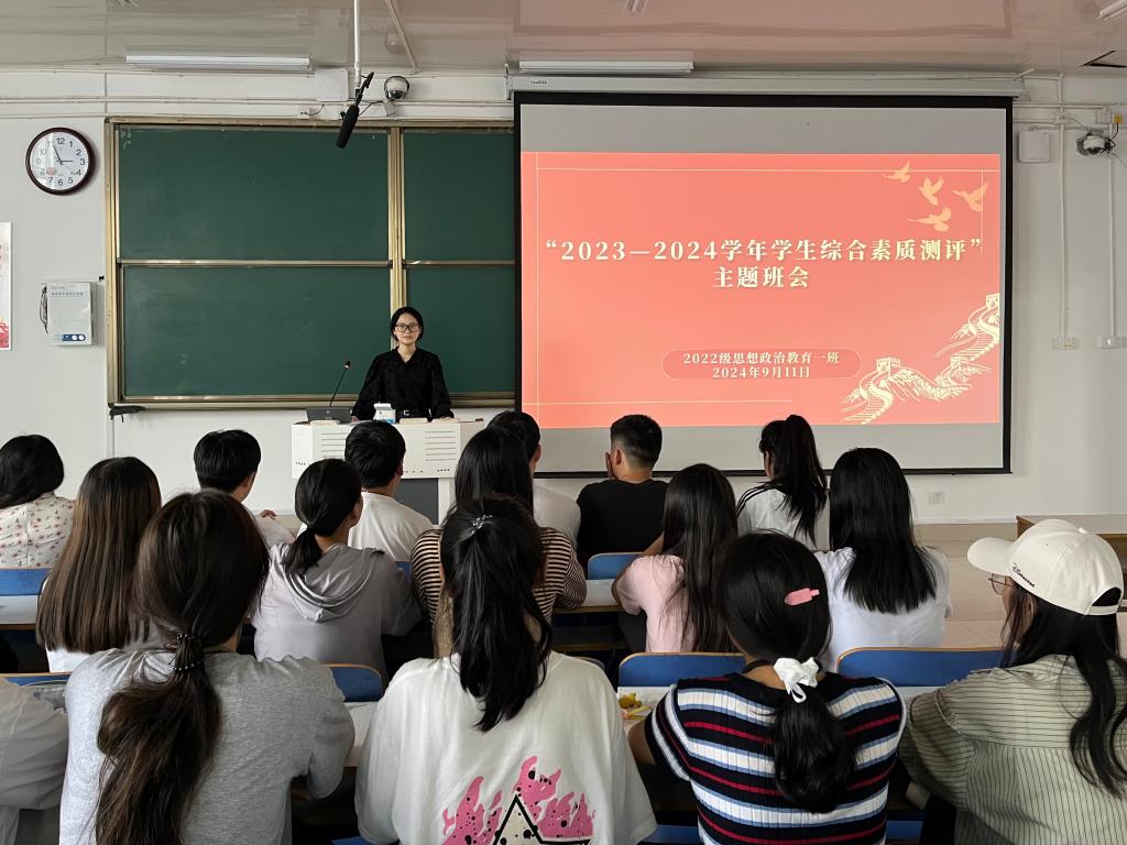 9月11日下午,2026年世界杯官网2022级思想政治教育一班在社科楼514教室召开“2023-2024学年员工综合素质测评”主题班会,公司2022级思想政治教育一班班主任王明园和一班全体同学共同参与本次班会,班会由团支书李佳茹主持。