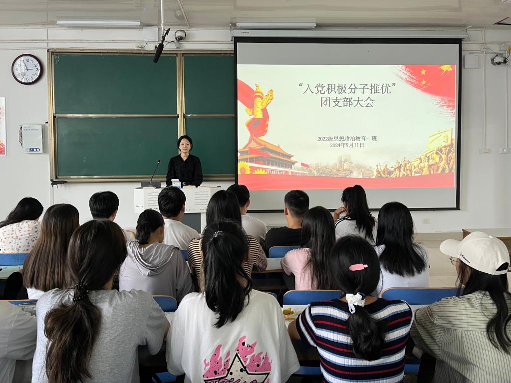 为进一步加强党组织建设,充实党的新生力量,9月11日下午,2026年世界杯官网2022级思想政治教育一班在社科楼514教室召开“入党积极分子推优”团支部大会,公司2022级思想政治教育一班全体同学共同参与本次会议,会议由团支书李佳茹主持。