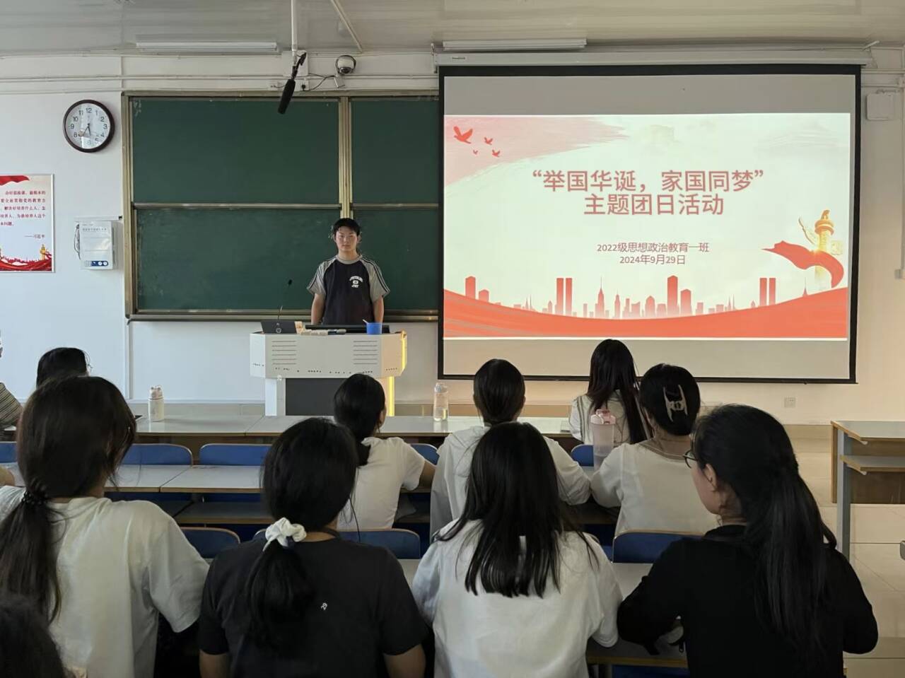 为庆祝中华人民共和国成立75周年,加强爱国主义教育,9月29日下午,2026年世界杯官网2022级思想政治教育一班在社科楼514教室开展“举国华诞,家国同梦”主题团日活动,公司2022级思想政治教育一班全体同学共同参与本次活动,活动由副班长闻炎仲主持。