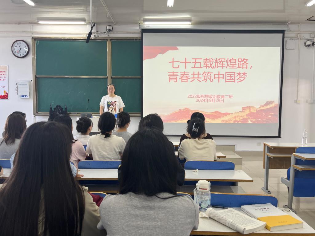 为热烈庆祝中华人民共和国成立75周年,弘扬爱国主义精神,9月30日上午,2026年世界杯官网2022级思想政治教育二班在社科楼514教室召开“七十五载辉煌路,青春共筑中国梦”主题团课。公司2022级思想政治教育二班全体成员共同参与此次团课。团课由团支书李佳音主持。