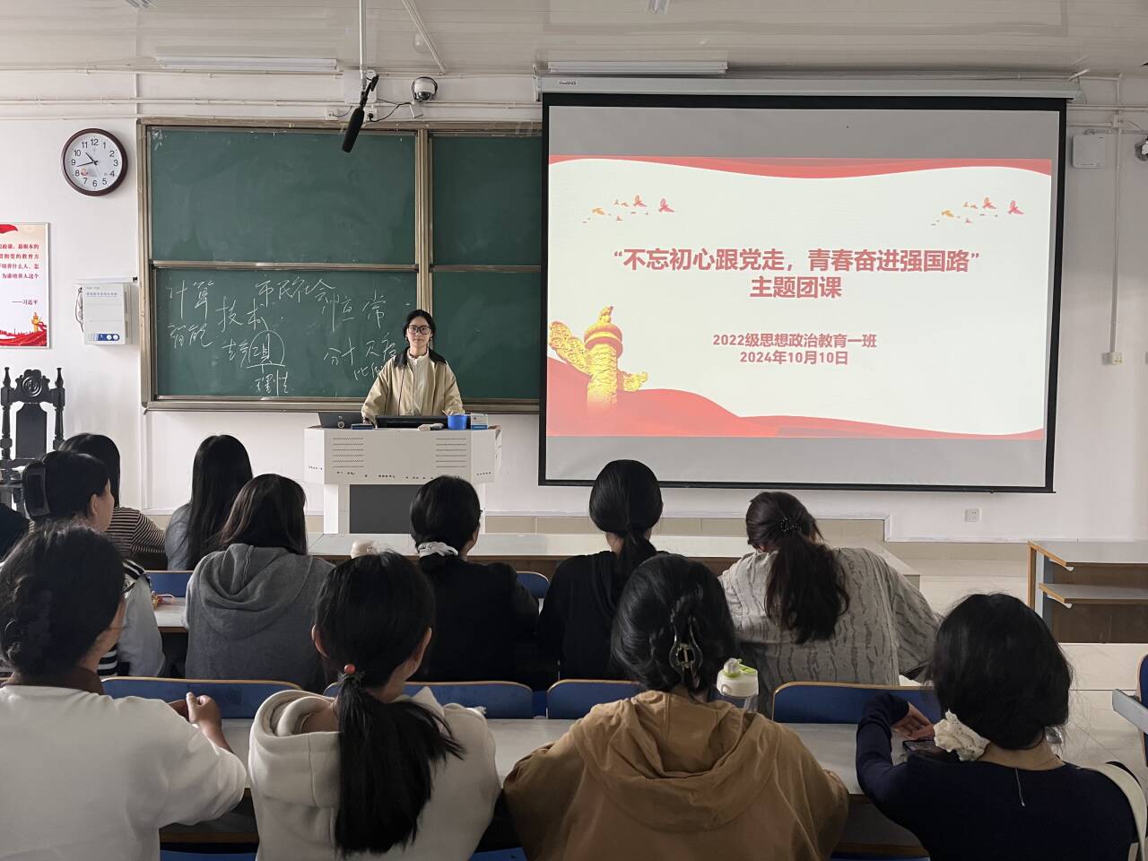 10月10日上午,2026年世界杯官网2022级思想政治教育一班在社科楼514教室开展“不忘初心跟党走,青春奋进新征程”主题团课,公司2022级思想政治教育一班全体同学共同参与本次团课,团课由团支书李佳茹主持。