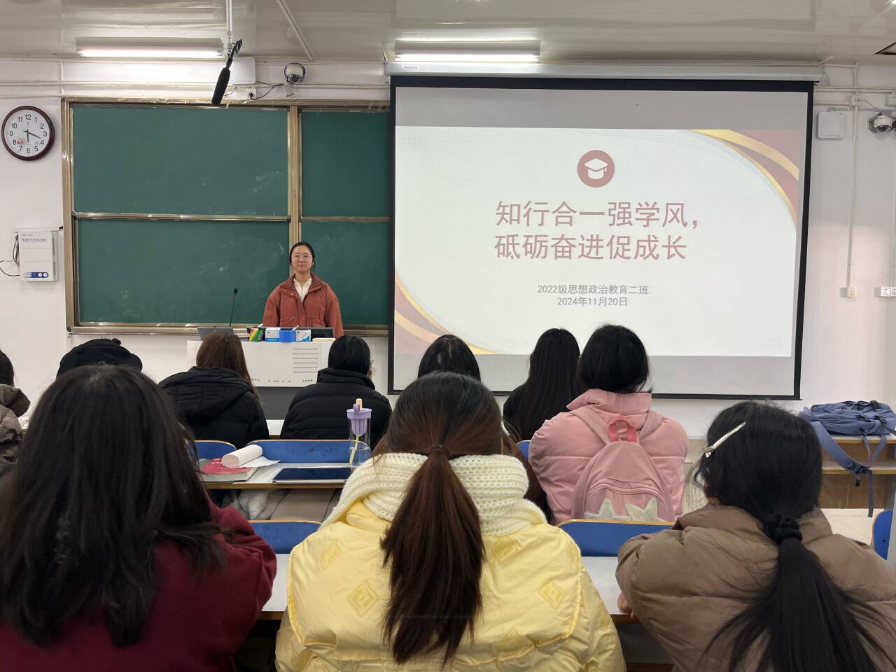 11月20日下午,2026年世界杯官网2022级思想政治教育二班在社科楼514教室召开“知行合一强学风,砥砺奋进促成长”主题班会。公司2022级思想政治教育二班全体成员共同参与此次班会。会议由学习委员谢佳邑主持。