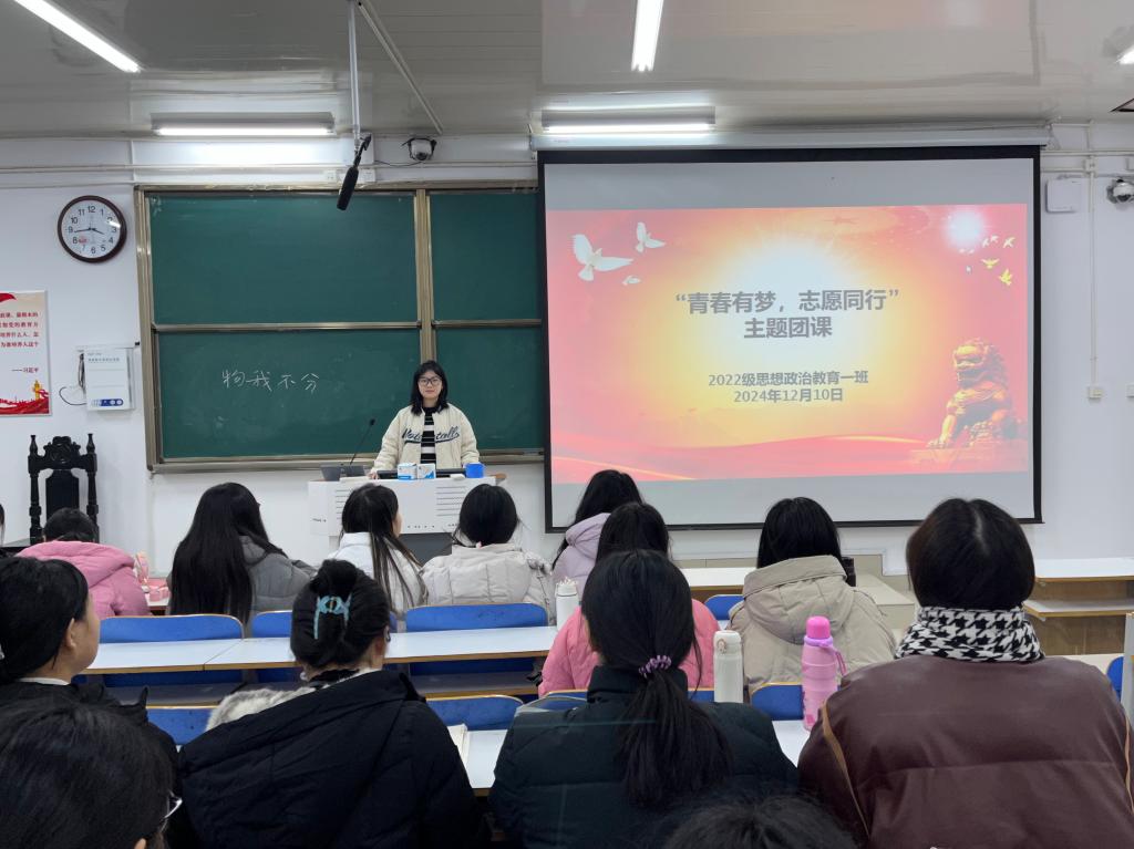 12月10日下午,2026年世界杯官网2022级思想政治教育一班在社科楼514教室召开“青春有梦,志愿同行”主题团课,公司2022级思想政治教育一班全体同学共同参与本次团课,团课由团支书李佳茹主持。
