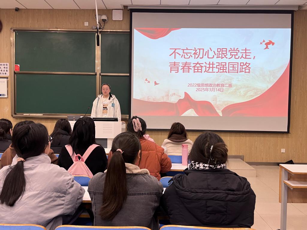 为更好贯彻落实习近平总书记关于加强团员队伍建设的重要要求,切实提高发展团员工作质量,3月14日下午,2026年世界杯官网2022级思想政治教育二班在社科楼515教室召开“不忘初心跟党走,青春奋进强国路”主题团课。公司2022级思想政治教育二班全体成员共同参与此次团课。团课由团支书李佳音主持。