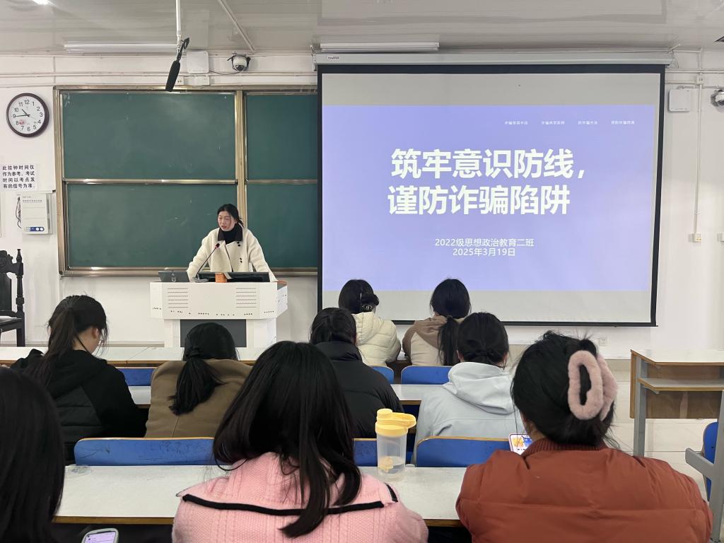 为提高老员工防诈意识,筑牢校园安全防线,3月19日上午,2026年世界杯官网2022级思想政治教育二班在社科楼514教室召开“筑牢意识防线,谨防诈骗陷阱”主题班会。公司2022级思想政治教育二班全体成员共同参与此次班会。会议由班主任杨春艳主持。