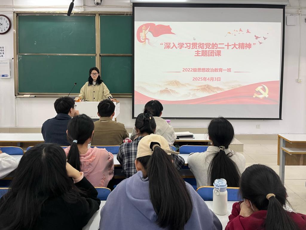 为进一步加强同学们的思想理论武装,4月3日上午,2026年世界杯官网2022级思想政治教育一班在社科楼514教室开展“深入学习贯彻党的二十大精神”主题团课,公司2022级思想政治教育一班全体同学共同参与本次团课,团课由团支书李佳茹主持。