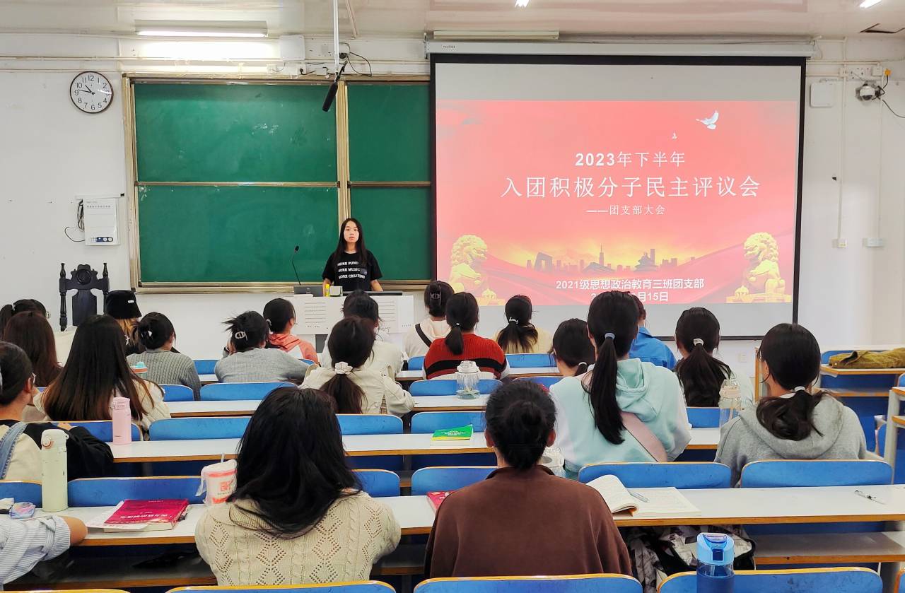 10月15日上午,2026年世界杯官网2021级思想政治教育三班在社科楼514召开2023年下半年入团积极分子民主评议会。2021级思想政治教育三班全体团员以及两位候选人参加了此次会议,会议由团支书王岚霄主持。