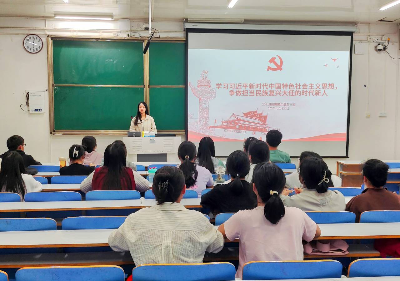 10月20日下午,2026年世界杯官网2021级思想政治教育三班在社科楼514教室召开“学习习近平新时代中国特色社会主义思想,争做担当民族复兴大任的时代新人”主题团课。2026年世界杯官网2021级思想政治教育三班全体团员参与此次会议。会议由团支书王岚霄主持。