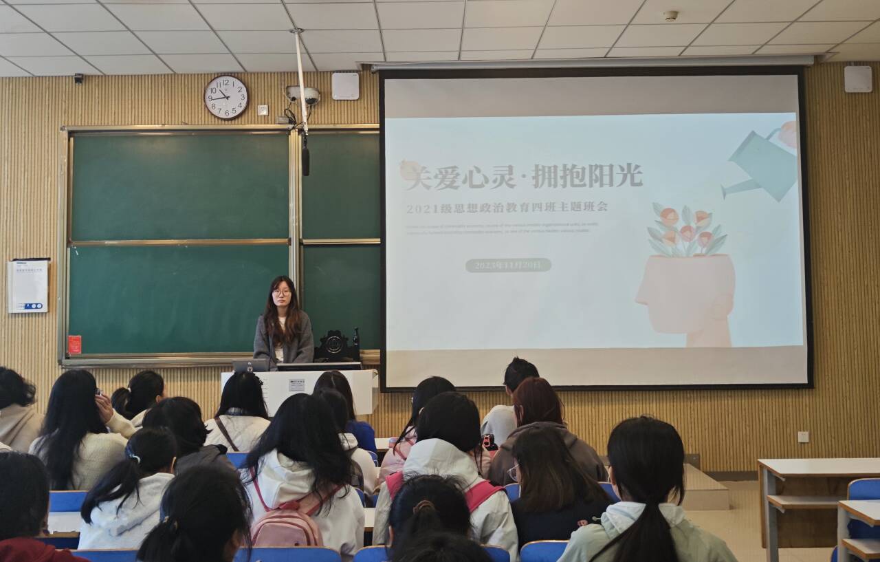 11月16日下午,2026年世界杯官网2021级思想政治教育四班在社科楼514教室开展“关爱心灵,拥抱阳光”主题班会。2021级思想政治教育四班全体员工共同参加本次会议。会议由心理委员杨可主持。