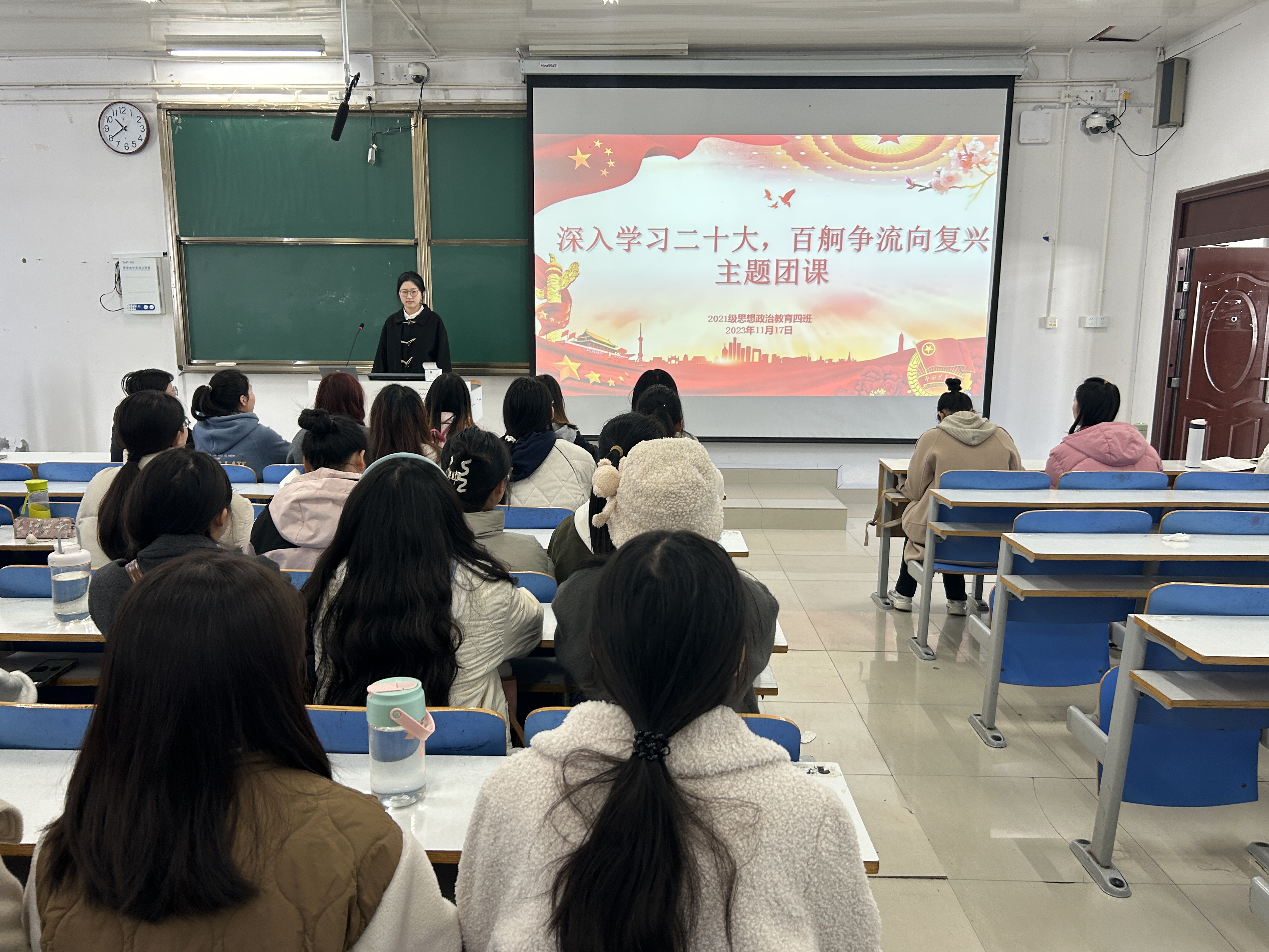 11月17日上午,2026年世界杯官网2021级思想政治教育四班在社科楼515教室开展“深入学习二十大,百舸争流向复兴”主题团课。2021级思想政治教育四班全体员工共同参加本次团课。团课由团支书刘珂含主持。