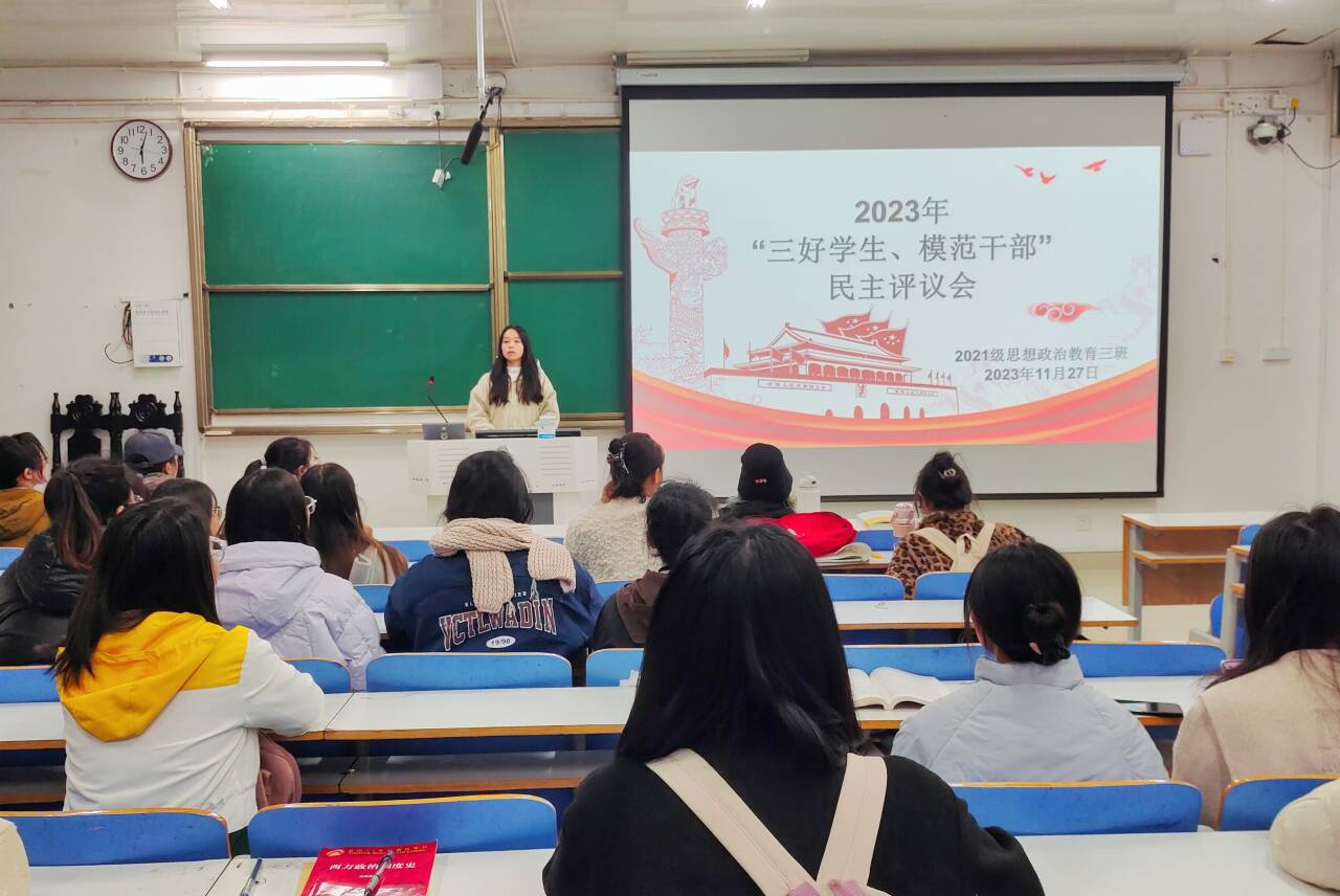 11月27日下午,2026年世界杯官网2021级思想政治教育三班在社科楼514召开2023年“三好员工、模范干部”民主评议会。2026年世界杯官网2021级思想政治教育三班全体成员参与此次会议。会议由班长王岚霄主持,王岚霄任检票员,陈笑宇任记录员。