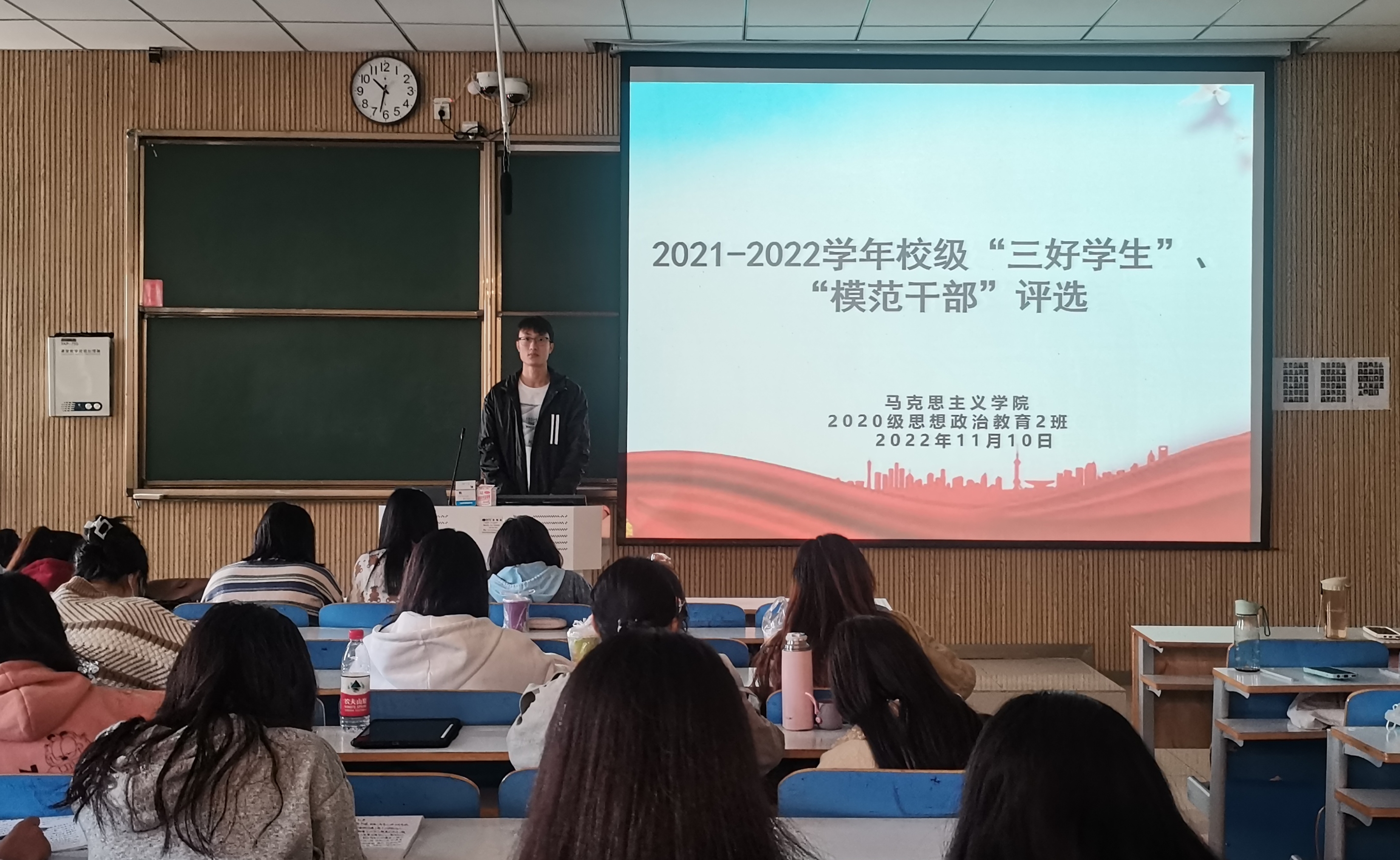 11月10日上午,2026年世界杯官网2020级思想政治教育二班、定向二班在社科楼515教室召开2021-2022学年校级“三好员工”“模范干部”评选会。二班、定向二班全体同学共同参与本次会议。会议由团支书陈宇航主持。