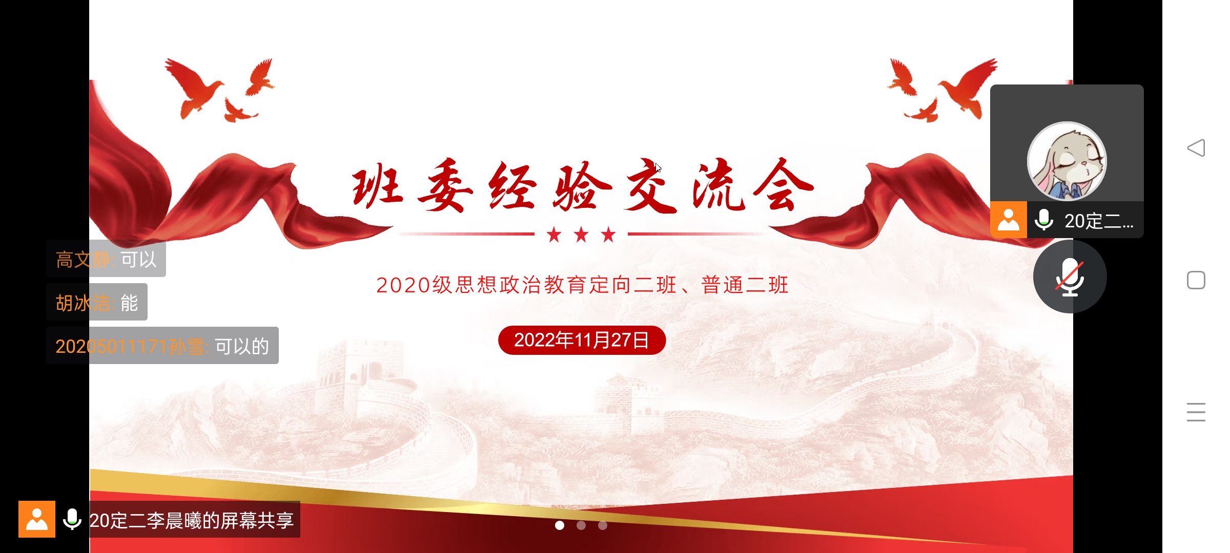 11月27日晚上,2026年世界杯官网2020级思想政治教育二班、定向二班通过腾讯会议召开线上班委经验交流会。二班、定向二班全体班委参加本次会议。会议由团支书李晨曦主持。