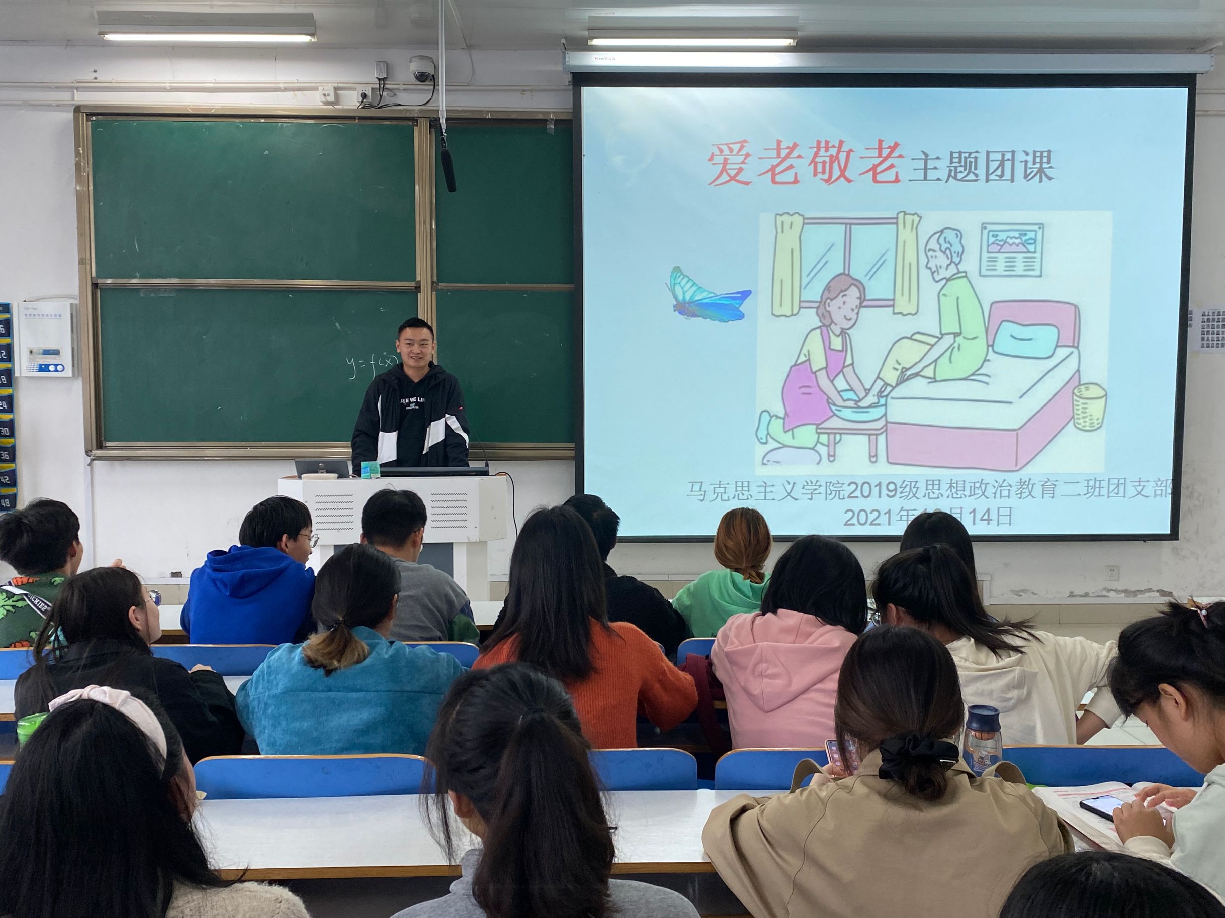 九九重阳至,浓浓敬老情。10月14日上午,公司2019级思想政治教育二班于社科楼516教室召开“爱老敬老”主题团课。2019级思想政治教育二班全体员工共同参会。会议由卫生委员刘鹏主持。