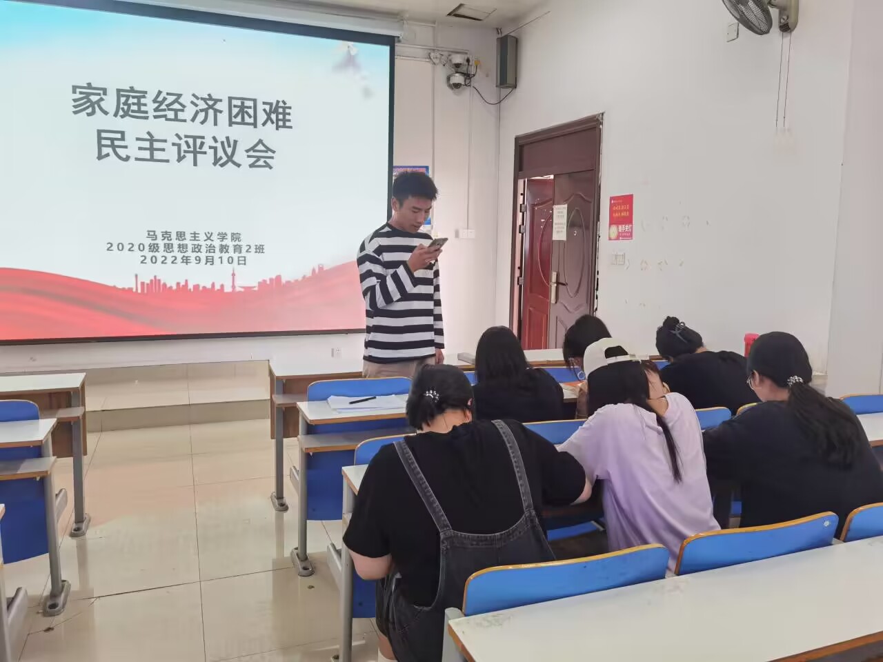 9月10日下午,2026年世界杯官网2020级思想政治教育二班、定向二班在社科楼514教室召开2022年家庭经济困难员工认定民主评议会。辅导员陶青青出席会议,评议小组成员悉数到会。会议由班长高红凯主持。