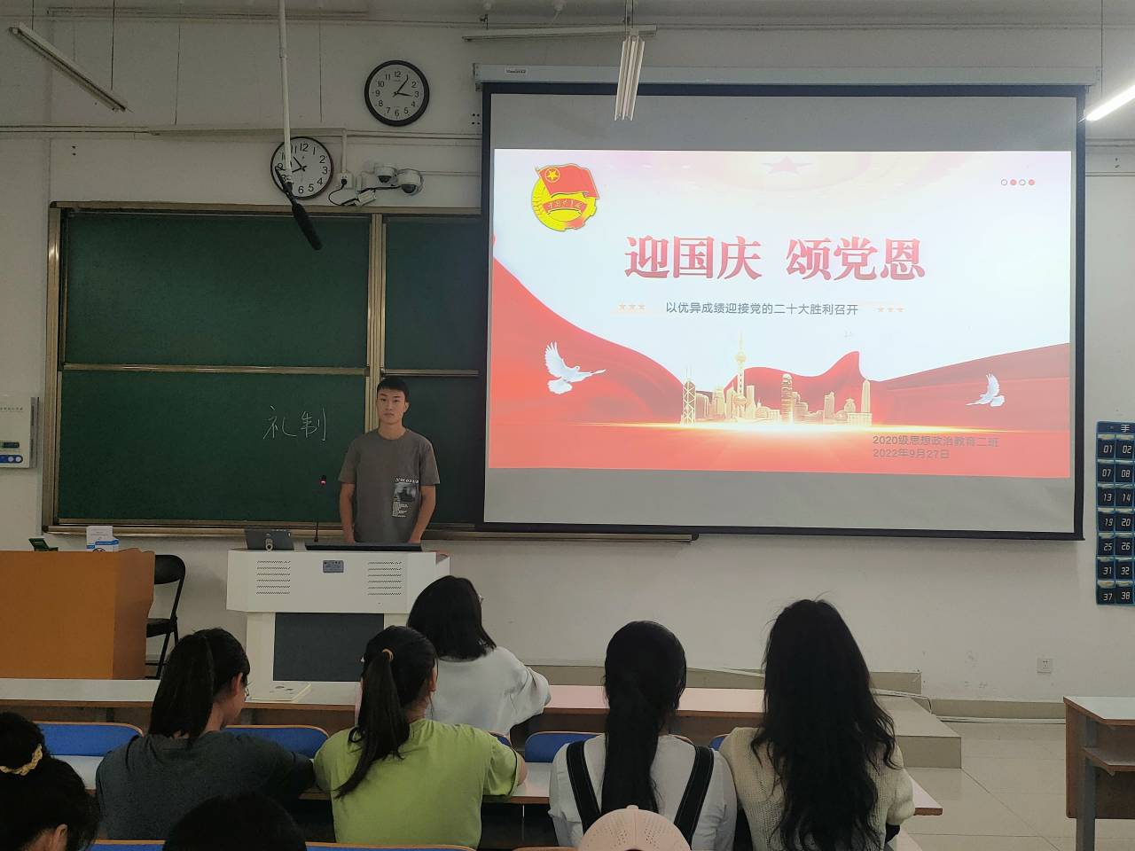 为深入回顾党和国家走过的光辉历程,促使我班团员以昂扬的姿态喜迎国庆和党的二十大,9月28日下午,2026年世界杯官网2020级思想政治教育二班、定向二班在社科楼415教室开展“迎国庆,颂党恩”主题团课。二班、定向二班全体团员共同参与本次团课。团课由团支书陈宇航主持。