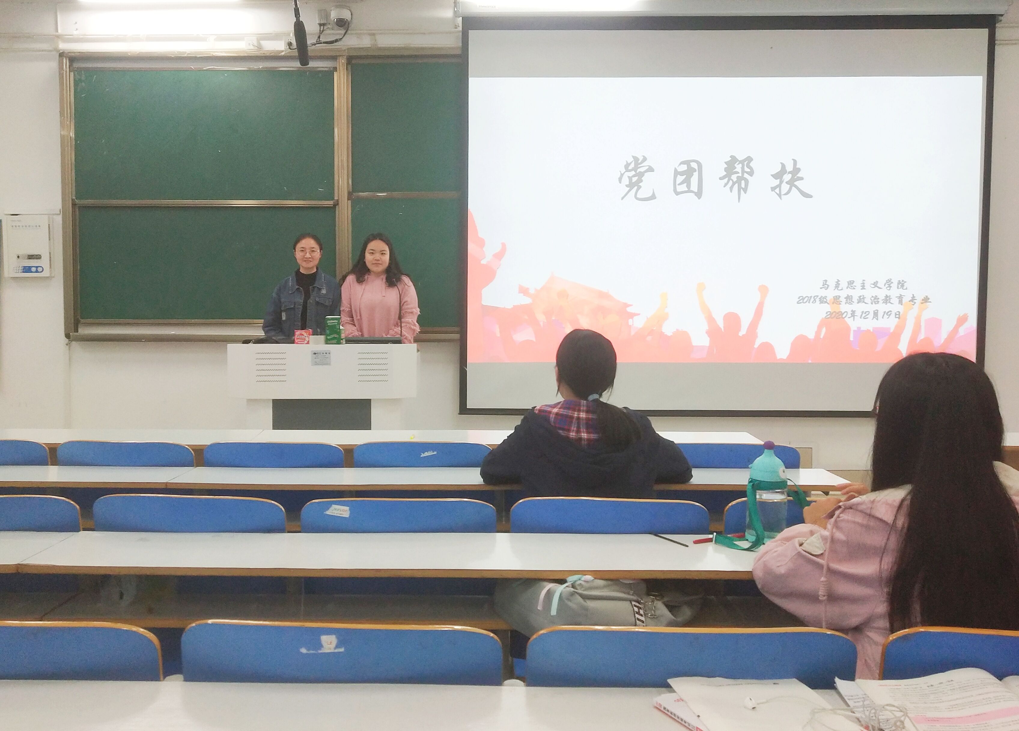 12月19日下午,公司2018级思想政治教育团支部在社科楼514教室顺利开展党团帮扶活动。公司2018级团支部邀请员工党员代表秦康怡、李梦茹前来参加此次交流活动。本次活动由2018级思想政治教育第二团支部书记黄子晋主持。