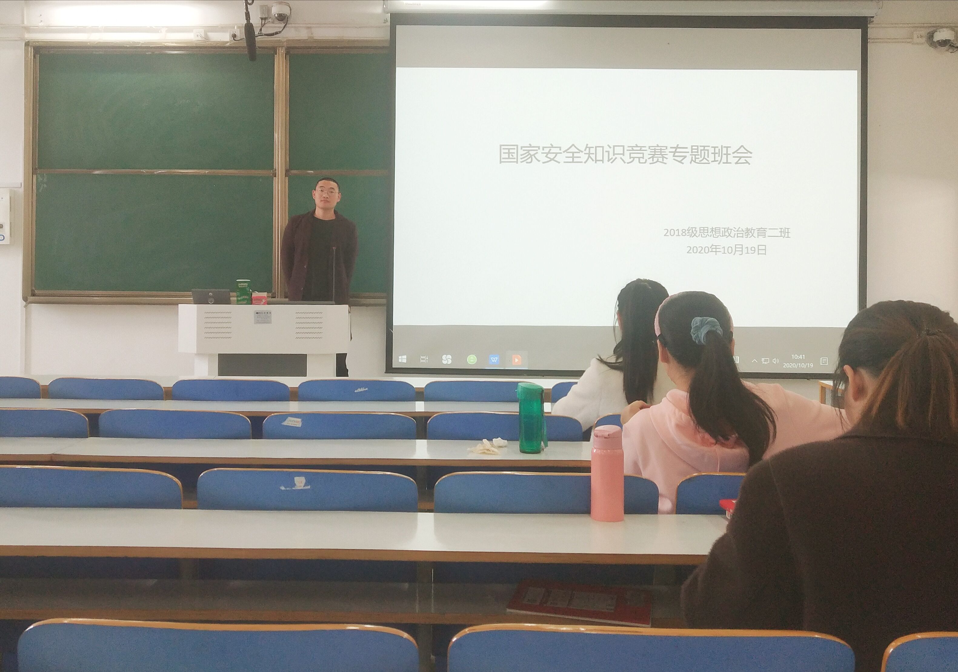 10月19日上午,公司2018级思想政治教育二班在社科楼514教室顺利开展“国防安全知识竞赛”专题班会。2018级思想政治教育二班全体成员共同参加了此次班会。会议由班长杨康主持。