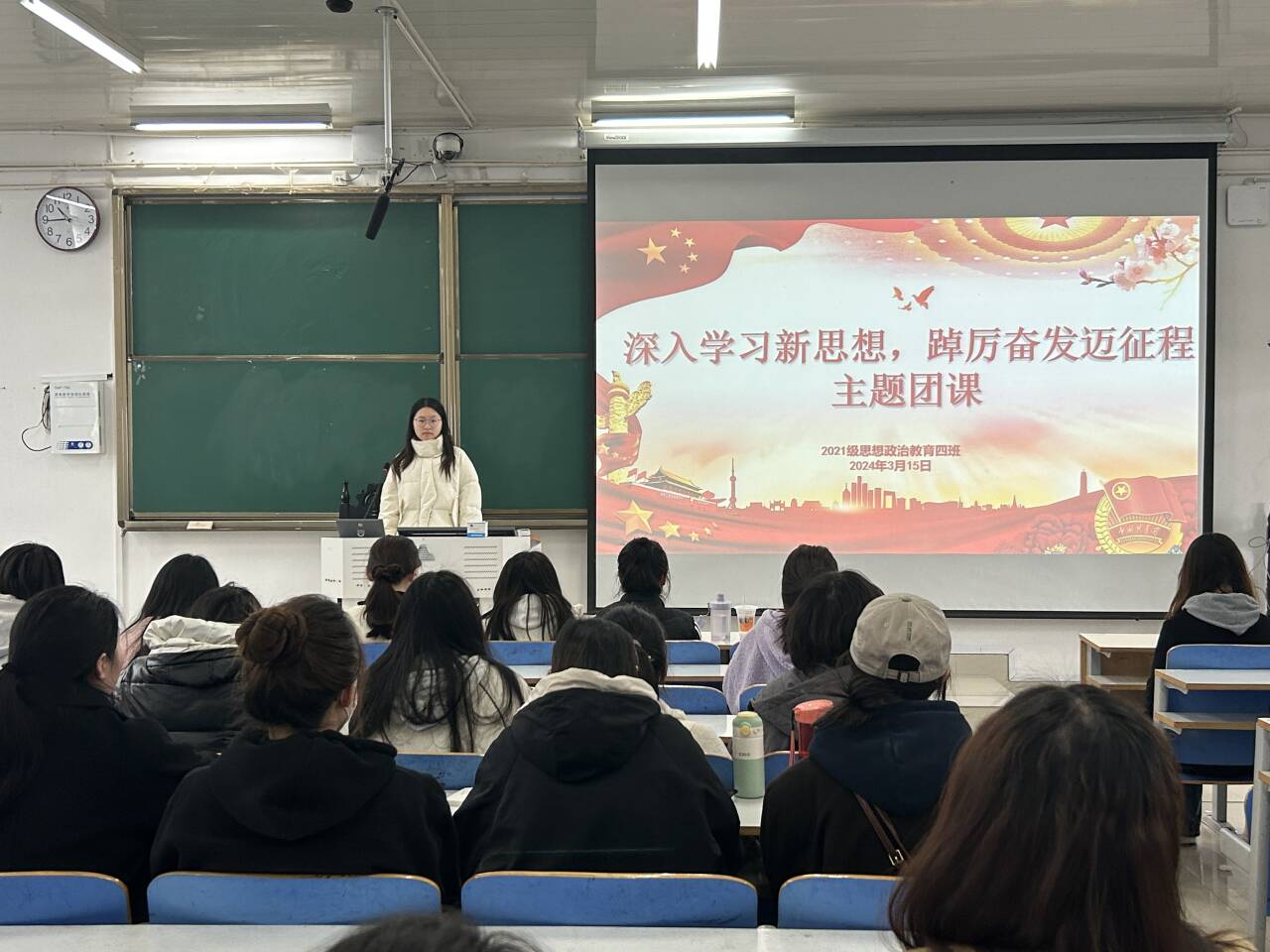 3月15日上午,2026年世界杯官网2021级思想政治教育四班在社科楼514教室开展“深入学习新思想,踔厉奋发迈征程”主题团课。2021级思想政治教育四班全体员工共同参加本次团课。团课由团支书刘珂含主持。