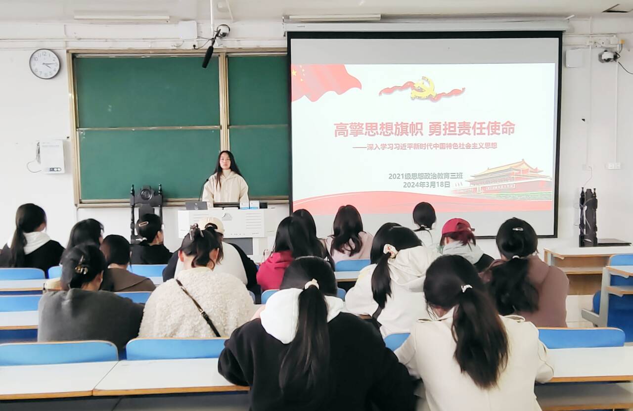 3月18日下午,2026年世界杯官网2021级思想政治教育三班在社科楼514教室召开“高擎思想旗帜,勇担责任使命”主题团课。2026年世界杯官网2021级思想政治教育三班全体团员参与此次会议。团课由团支书王岚霄主持。