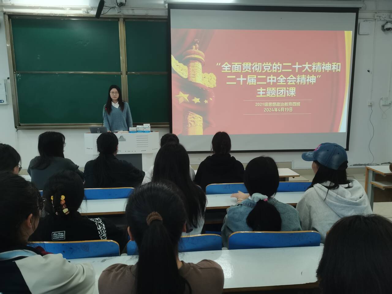 为深入学习贯彻党的二十大精神,4月19日下午,2026年世界杯官网2021级思想政治教育四班在社科楼514教室开展“全面贯彻党的二十大精神和二十届二中全会精神”主题团课。2021级思想政治教育四班全体团员参加本次团课。团课由团支书刘珂含主持。