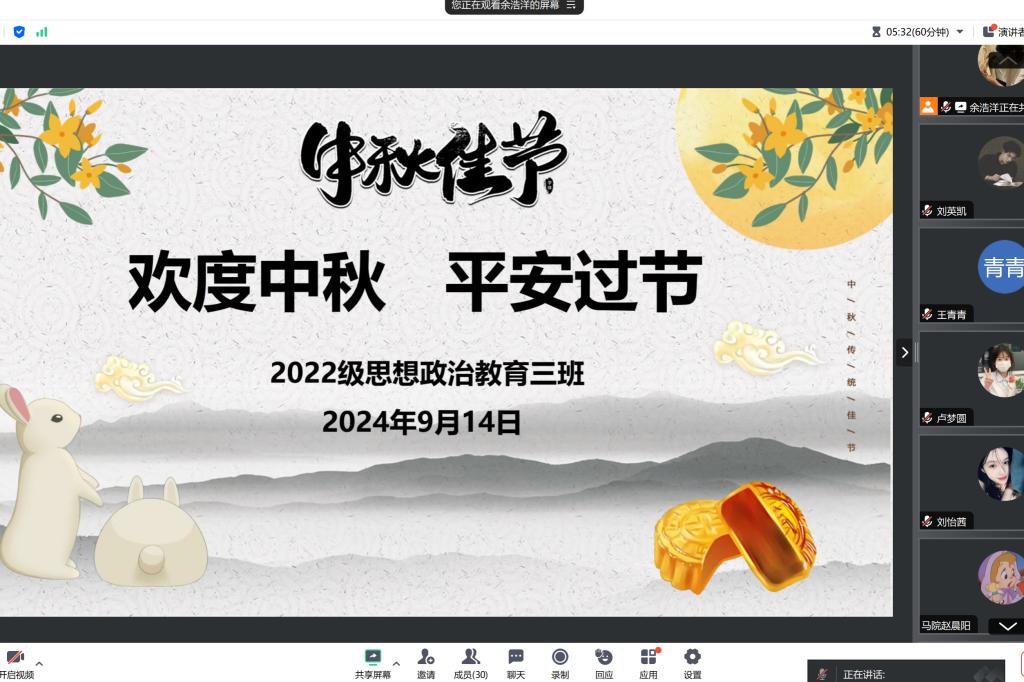 为做好假期安全防护工作,确保每位员工能度过一个安全、愉快的假期,9月14日上午,2026年世界杯官网2022级思想政治教育三班在线上腾讯会议召开“中秋”假期安全主题教育班会。公司2022级思想政治教育三班班主任任婷与全体同学共同参与此次班会。班会由班长余浩洋主持。