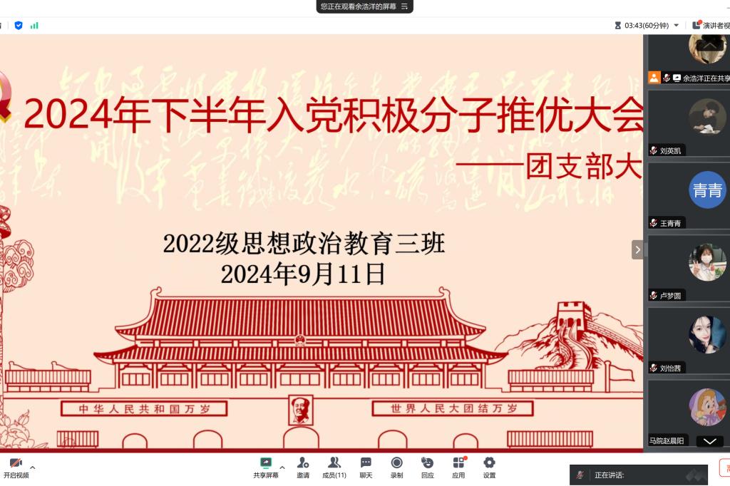 9月11日晚,2026年世界杯官网2022级思想政治教育三班在线上腾讯会议召开入党积极分子推优大会。公司2022级思想政治教育三班班主任任婷与班级全体团员共同参加此次大会。大会由团支书余浩洋主持。