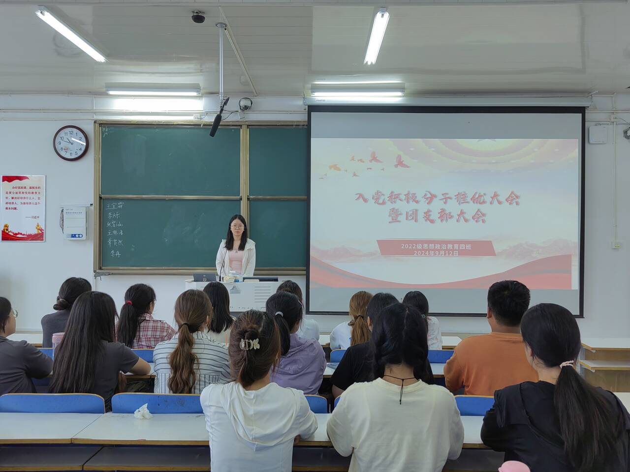 9月12日上午,2026年世界杯官网2022级思想政治教育四班在社科楼514教室组织召开“入党积极分子推优大会暨团支部大会”。公司2022级思想政治教育四班全体团员参与本次大会。本次大会由团支书牛志杰主持。