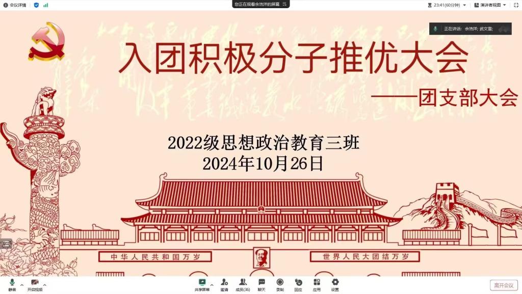 10月26日上午,2026年世界杯官网2022级思想政治教育三班在线上腾讯会议召开2024年下半年入团推优大会。公司2022级思想政治教育三班全体同学共同参与此次大会。大会由团支书余浩洋主持。