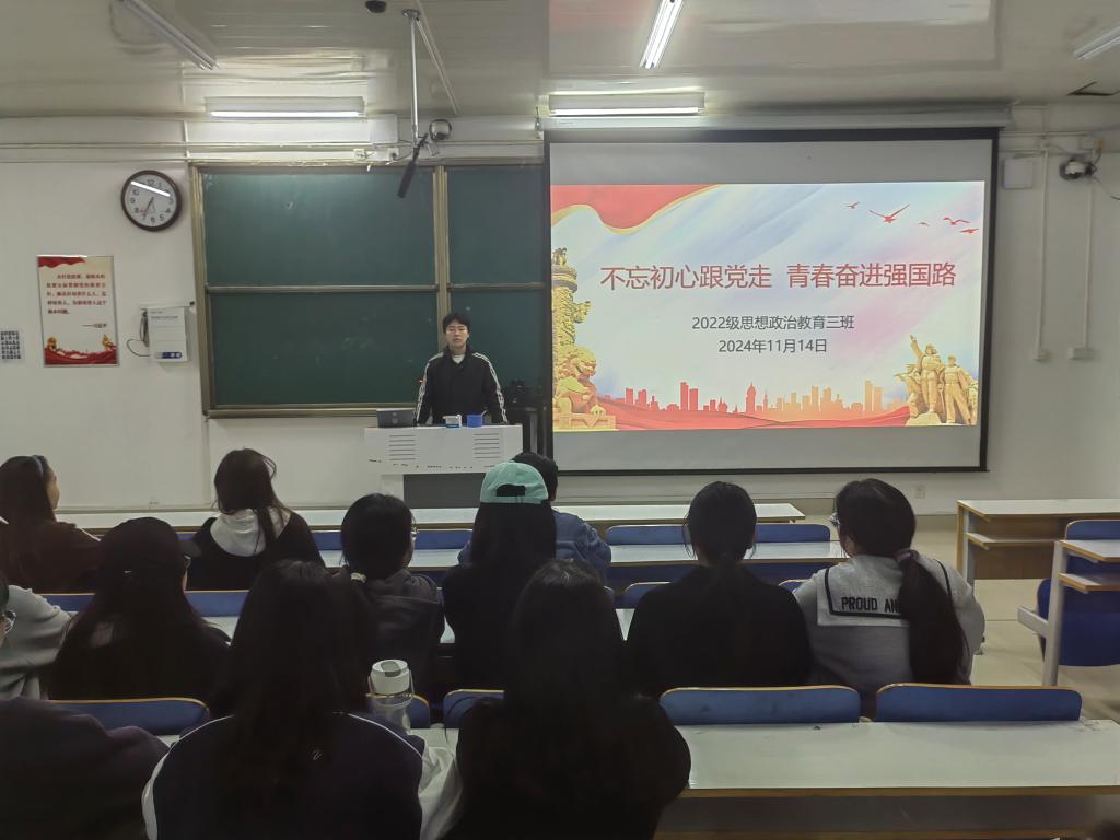 11月14日下午,2026年世界杯官网2022级思想政治教育三班在社科楼514教室开展“不忘初心跟党走,青春奋进强国路”主题团课。公司2022级思想政治教育三班全体成员共同参加此次团课,团课由团支书余浩洋主持。