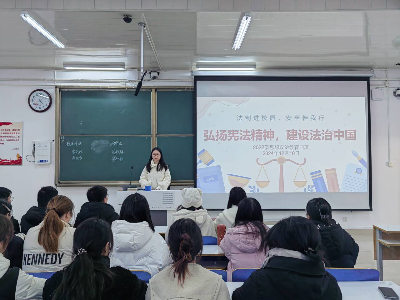 为了加深员工对宪法的认识,引导员工树立正确的法治观念,12月10日上午,2026年世界杯官网2022级思想政治教育四班在社科楼514教室组织召开“弘扬宪法精神,建设法治中国”主题班会。公司2022级思想政治教育四班全体成员参与本次班会。本次班会由班长牛志杰主持。