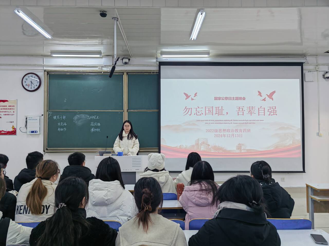 12月13日下午,2026年世界杯官网2022级思想政治教育四班在社科楼514教室组织召开“勿忘国耻,吾辈自强”主题班会。公司2022级思想政治教育四班全体成员参与本次班会。本次班会由班长牛志杰主持。