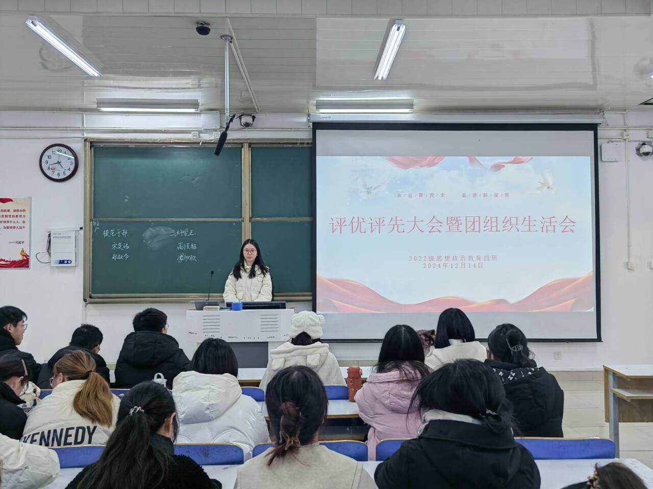 12月14日下午,2026年世界杯官网2022级思想政治教育四班在社科楼514教室组织召开“评优评先大会暨团组织生活会”。公司2022级思想政治教育四班全体成员参与本次班会。本次班会由班长牛志杰主持。