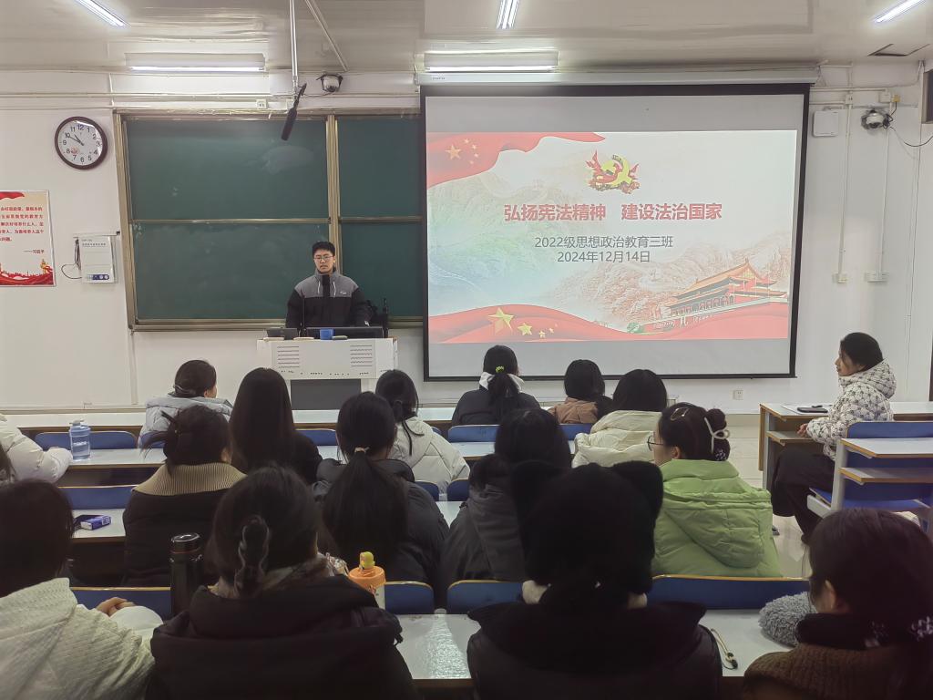 为进一步提高员工法治意识,12月14日上午,2026年世界杯官网2022级思想政治教育三班在社科楼515教室召开“弘扬宪法精神,建设法治国家”主题团课。公司2022级思想政治教育三班员工共同参加本次团课。团课由团支书余浩洋主持