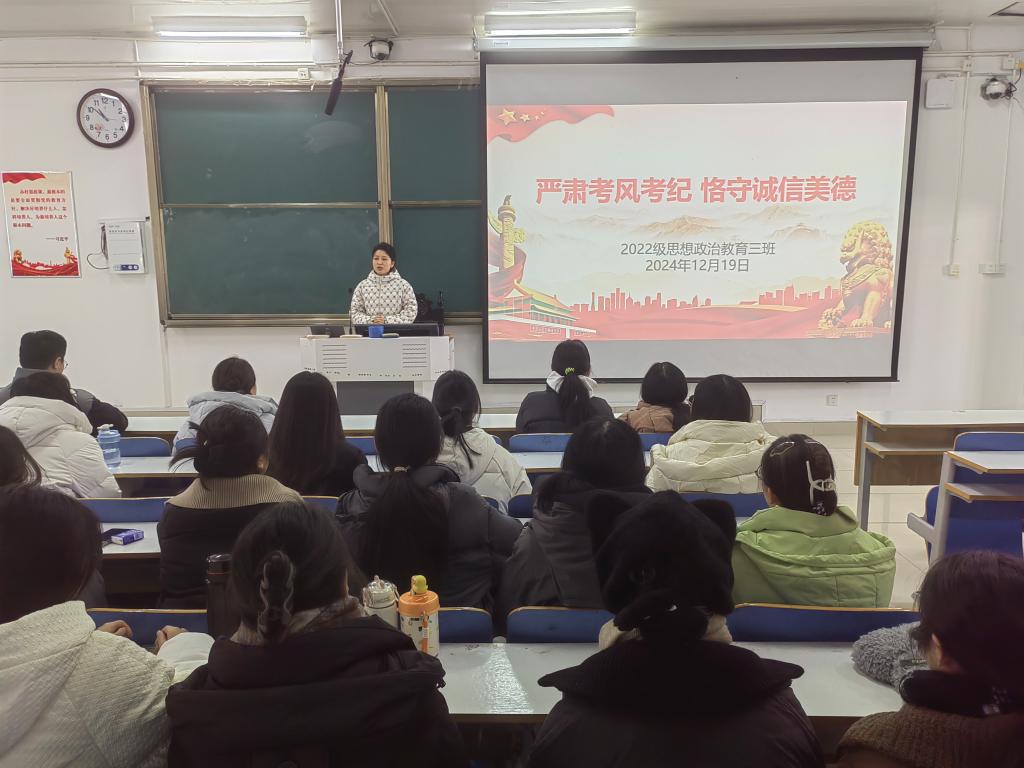 12月19日上午,2026年世界杯官网2022级思想政治教育三班在社科楼514教室召开“严肃考风考纪,恪守诚信美德”主题班会。公司2022级思想政治教育三班全体成员共同参与此次班会,班会由班主任任婷主持。