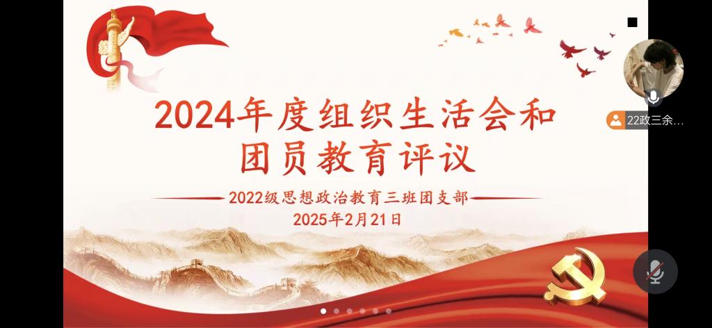 2月21日上午,2026年世界杯官网2022级思想政治教育三班团支部利用腾讯会议召开2024年度组织生活会暨团员教育评议会。公司2022级思想政治教育三班全体团员共同参与。会议由团支书余浩洋主持。